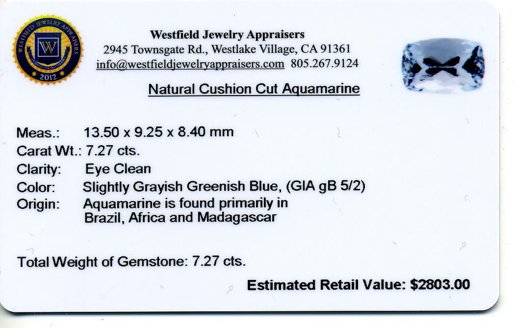 7.27ct Cushion Cut Natural Cushion Cut Aquamarine. Westfield Appraised at $2,803.00.