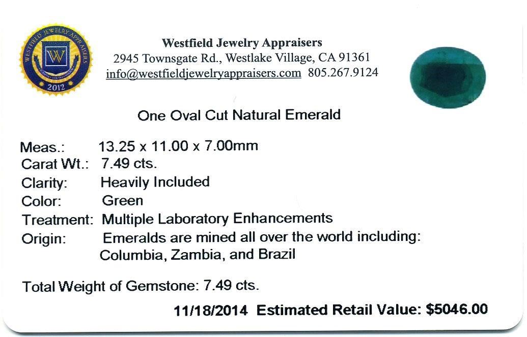 7.49ct. One Oval Cut Natural Emerald Westfield Appraised at $5,046.00.
