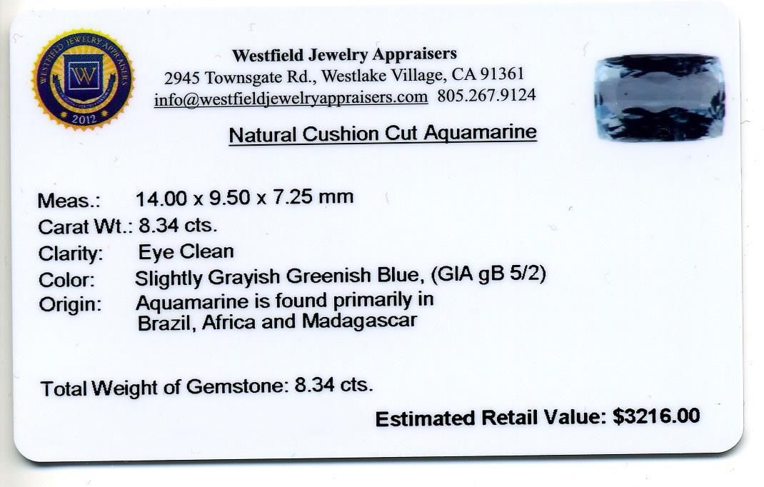 8.34ct Cushion Cut Natural Cushion Cut Aquamarine. Westfield Appraised at $3,216.00.