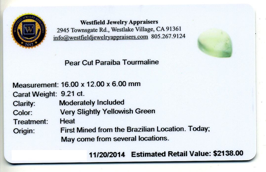 9.21ct. Pear Cabochon Cut Paraiba Tourmaline Westfield Appraised at $2,138.00.