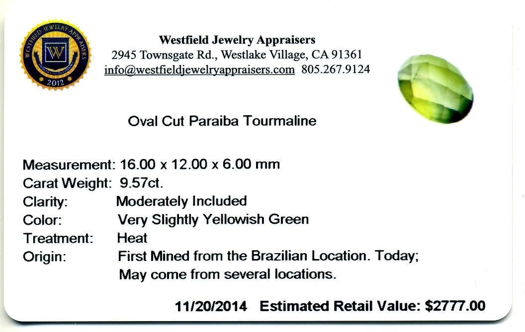 9.57ctw. Oval Cut Paraiba Tourmaline. Westfield Appraised at $2,777.00.