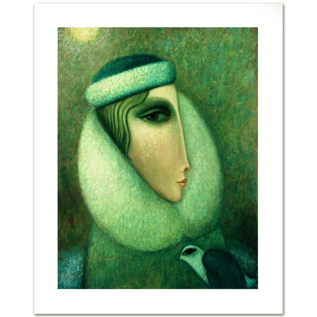 Combining time-honored religious icon painting with western style portraiture, the hauntingly beautiful art of Sergey Smirnov (1953-2006) is inspired by the 'Parsuna' art movement. "Alina" is a limited edition mixed media on canvas, printed in 2006, numbered in verso and hand signed by the artist. Measures approx. 13" x 17" (image).