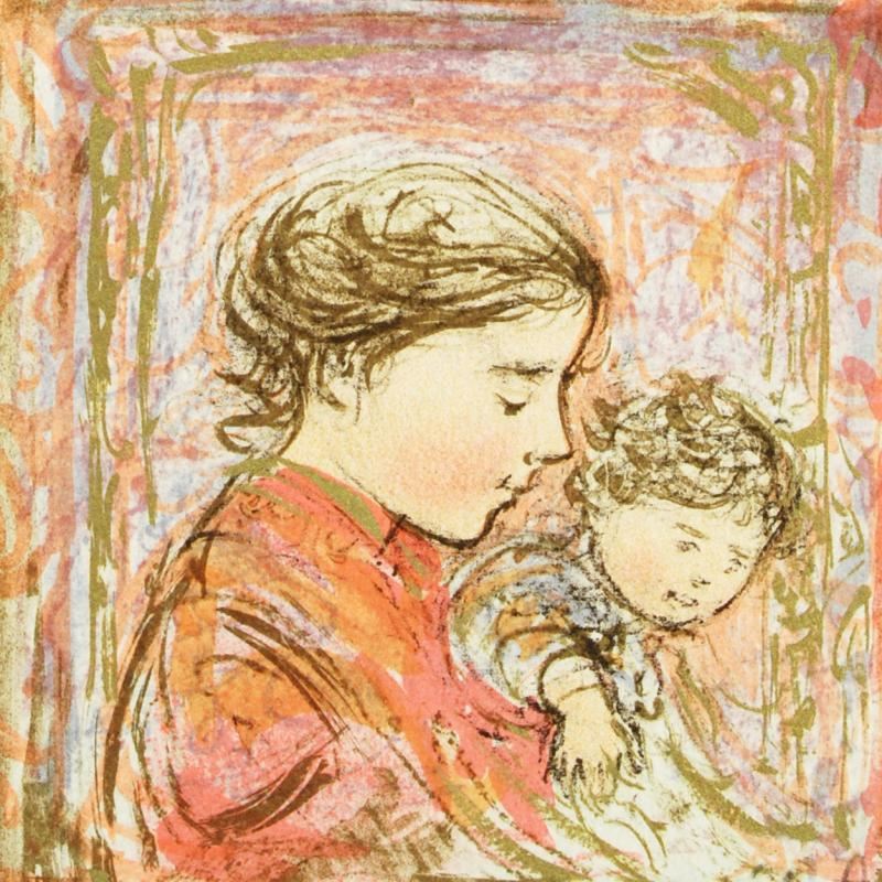 "Amanda" is a limited edition lithograph on paper, numbered and hand signed by Edna Hibel (1917-2014). Measures approx. 6" x 6" (no border).