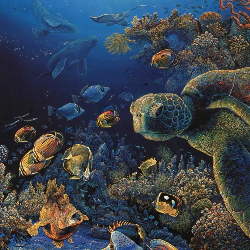 "An Underwater Congress" is a limited edition mixed media on paper by Robert Lyn Nelson, numbered and hand signed by the artist! Includes Certificate of Authenticity! Measures Approx: 24.5" X 39.5" (with border), 20.5" X 34.5" inches (image).