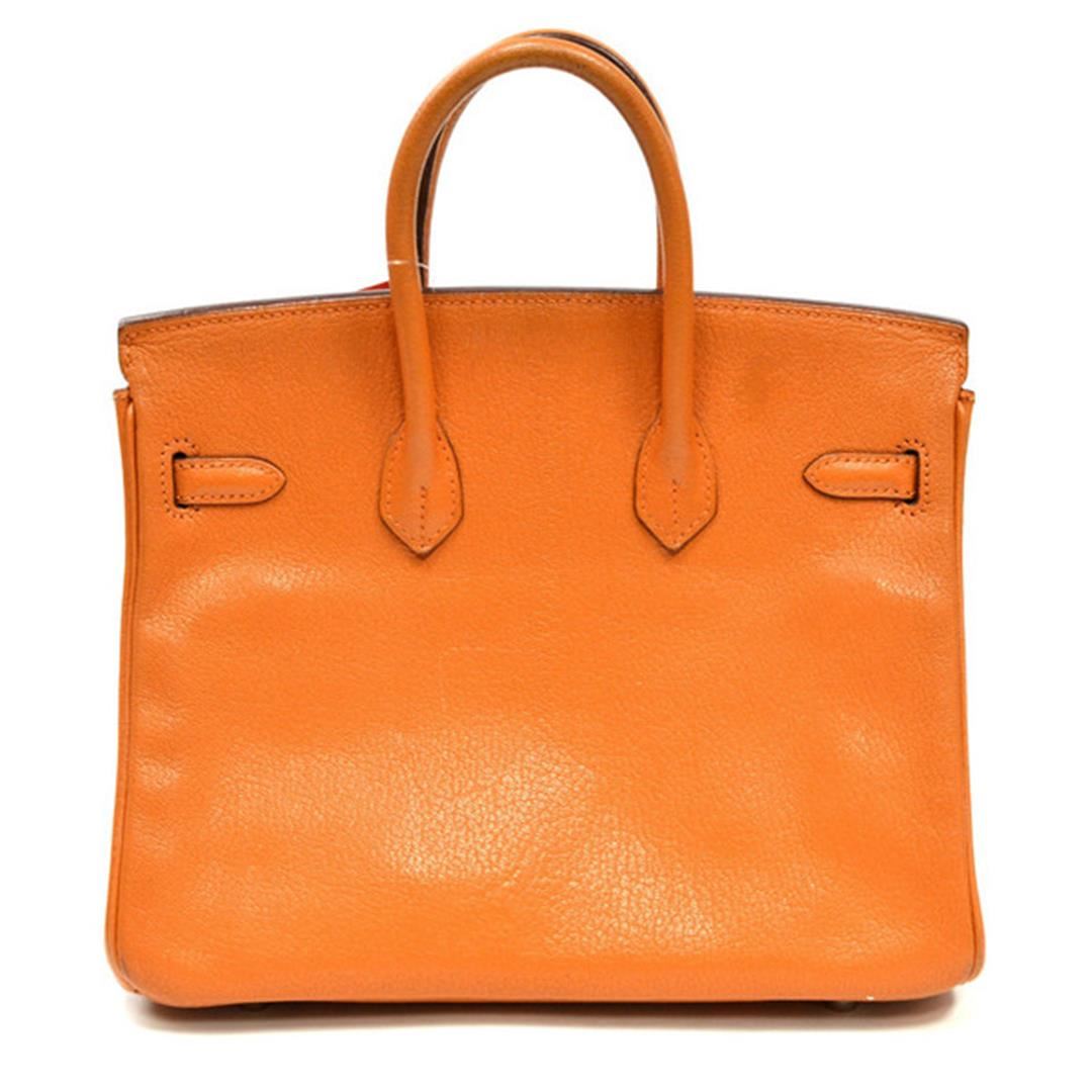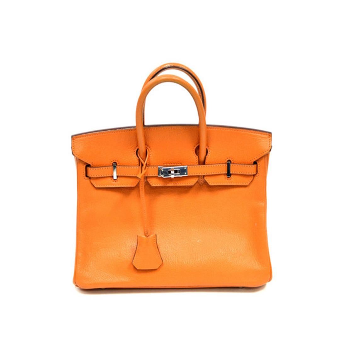 Authentic Hermes Birkin in a bright orange color way, giving you the perfect pop of color for Spring. It features palladium hardware throughout, which sits perfectly against the sunny hue. The bag is crafted from a type of calf leather known as ardenne, which is becoming rare since being discontinued by Hermes. It comes in good condition, having been pre-owned. Date stamp of X circle. 25cm size.