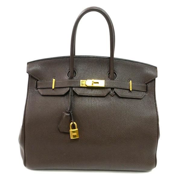 Authentic Hermes Birkin in a chocolate brown colorway. The bag is crafted from clemence leather which is considered to be one of the most hard wearing of Hermes leathers. The grain of this textured leather helps to prevent scratches, yet is still soft to touch. The bag features gold hardware throughout, and a date stamp of box L. It is in very good condition. 35cm size.