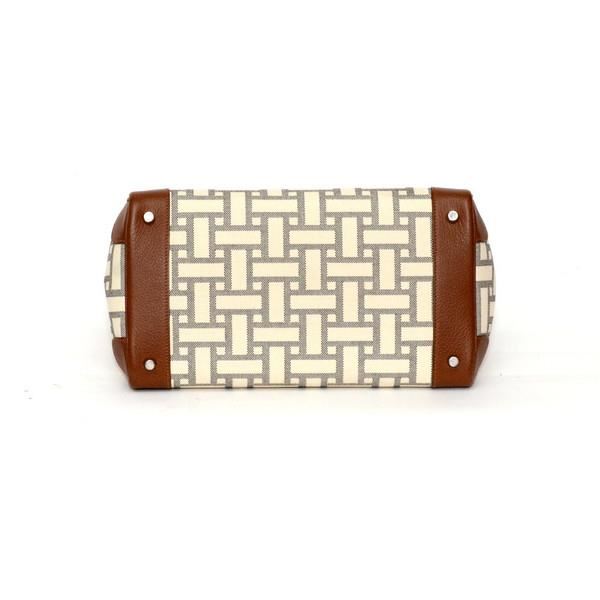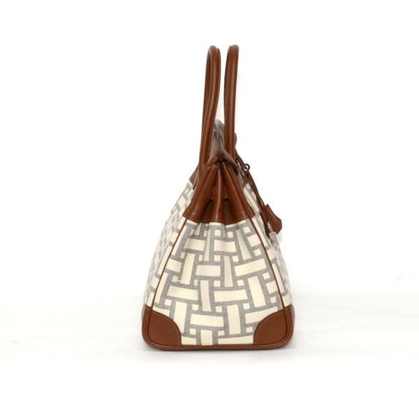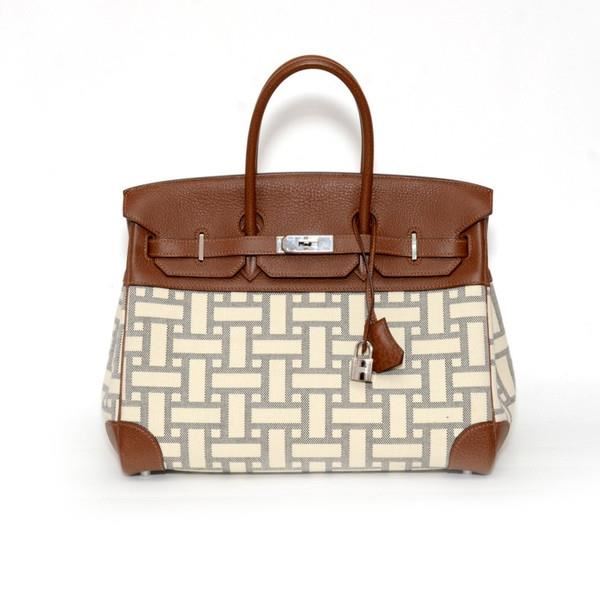 Authentic Hermes Birkin in a fun two tone canvas barenia, featuring palladium hardware throughout. A perfect bag for Spring, the prints combined with the golden leather create a timeless, yet very modern feel. It comes in excellent condition. Date stamp of L square. 35cm size.