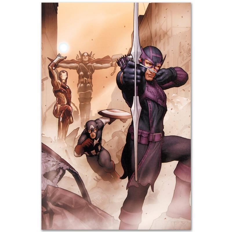 A piece of comic book history, this limited edition print, drawn by John Tyler Christopher, features Hawkeye with Captain America, Iron Man, and Thor. A cover artist for Marvel, John Tyler Christopher has working on the Avengers and X-men franchises, among others. "Avengers: Solo #1" is a limited edition numbered giclee on stretched canvas by John Tyler Christopher presented by Marvel Comics. This piece comes gallery wrapped and ready to hang. Measures approx. 18" x 27" (image); 1.5" (depth).