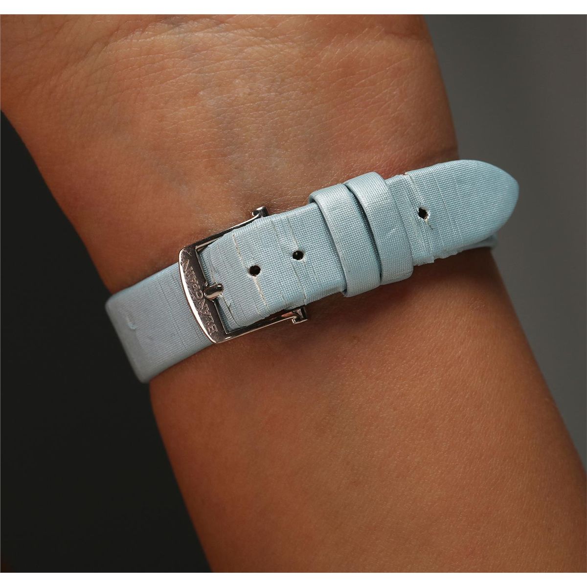 One Blancpain Villeret wristwatch featuring: 18KT White Gold case, crown, lugs, Diamond bezel, blue leather bracelet with buckle, Swiss automatic movement, white mother of pearl dial with analog display, hour and minute hands, Roman numerals, diamond hour markers. This item measures 30mm across, including crown, and weighs a total of 26.60 grams.