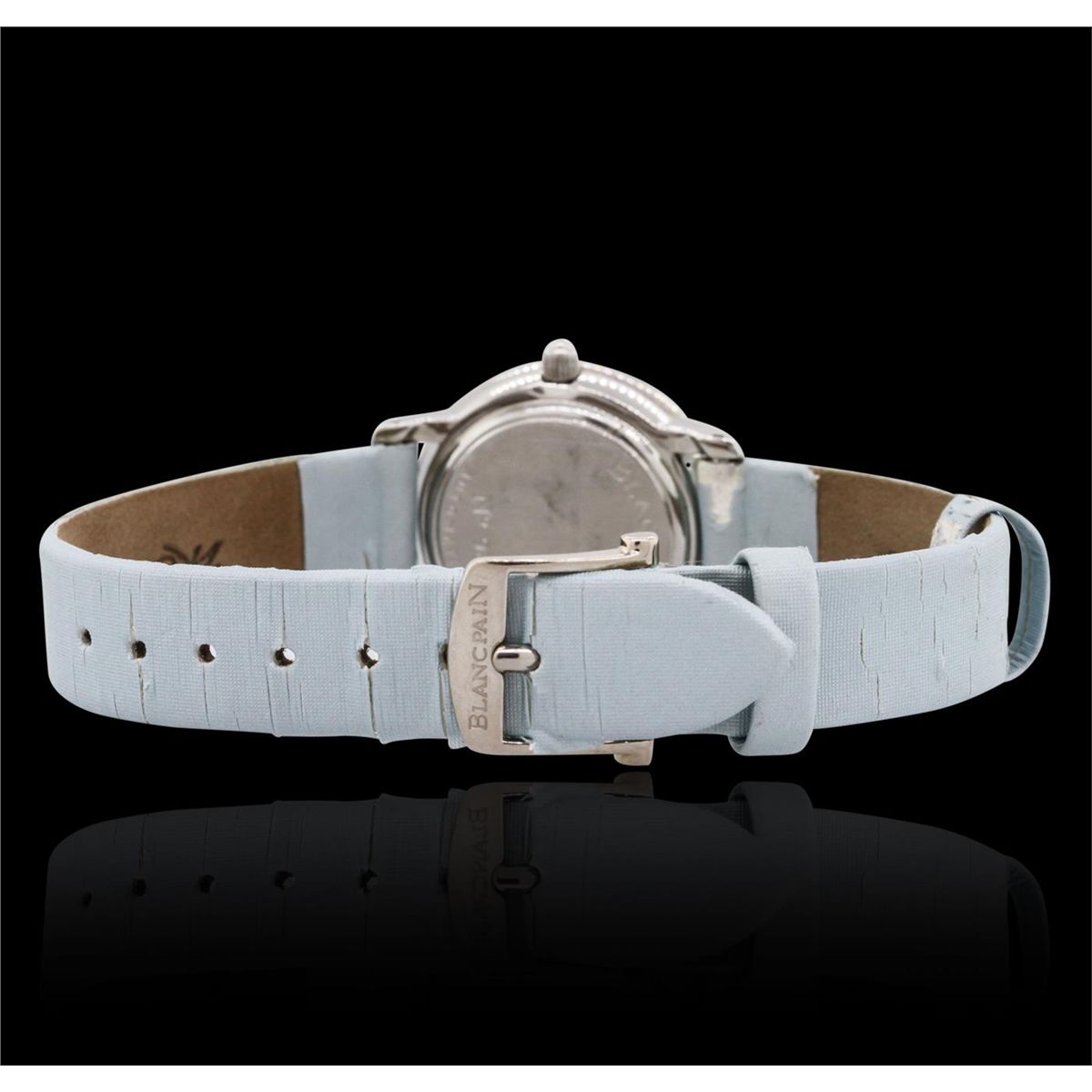 One Blancpain Villeret wristwatch featuring: 18KT White Gold case, crown, lugs, Diamond bezel, blue leather bracelet with buckle, Swiss automatic movement, white mother of pearl dial with analog display, hour and minute hands, Roman numerals, diamond hour markers. This item measures 30mm across, including crown, and weighs a total of 26.60 grams.