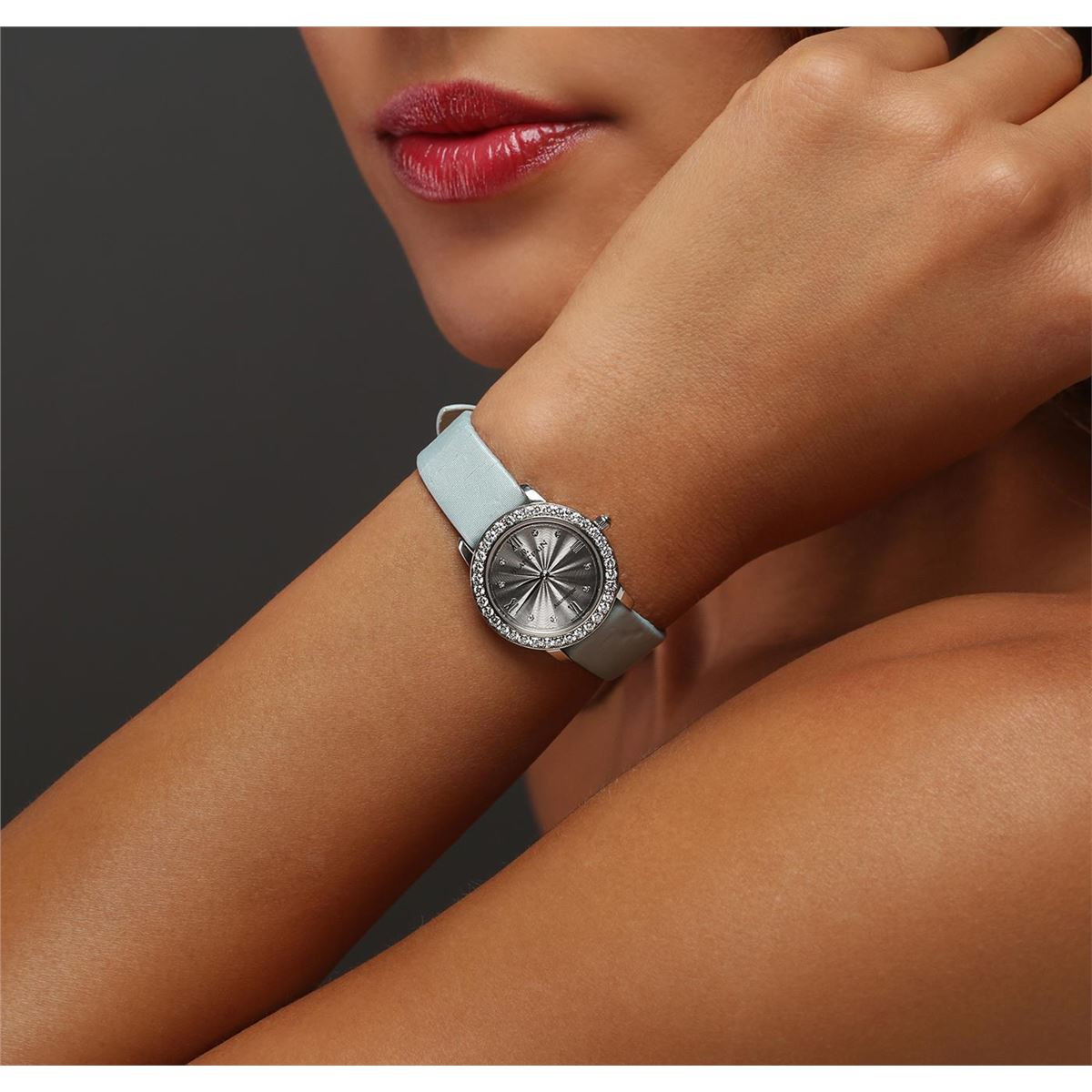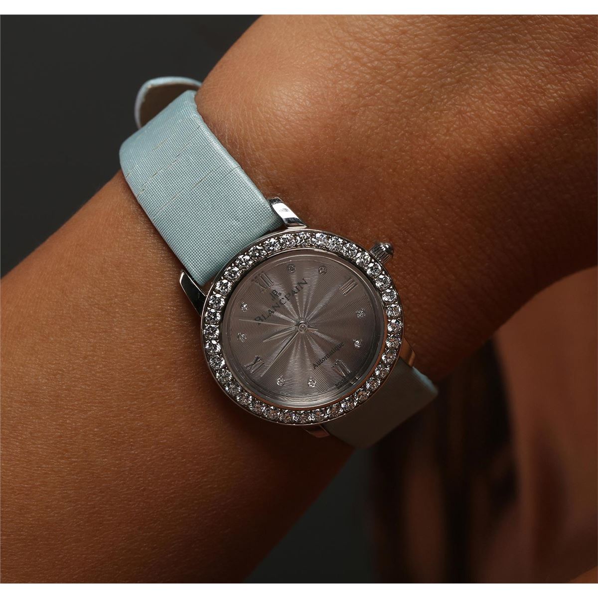 One Blancpain Villeret wristwatch featuring: 18KT White Gold case, crown, lugs, Diamond bezel, blue leather bracelet with buckle, Swiss automatic movement, white mother of pearl dial with analog display, hour and minute hands, Roman numerals, diamond hour markers. This item measures 30mm across, including crown, and weighs a total of 26.60 grams.