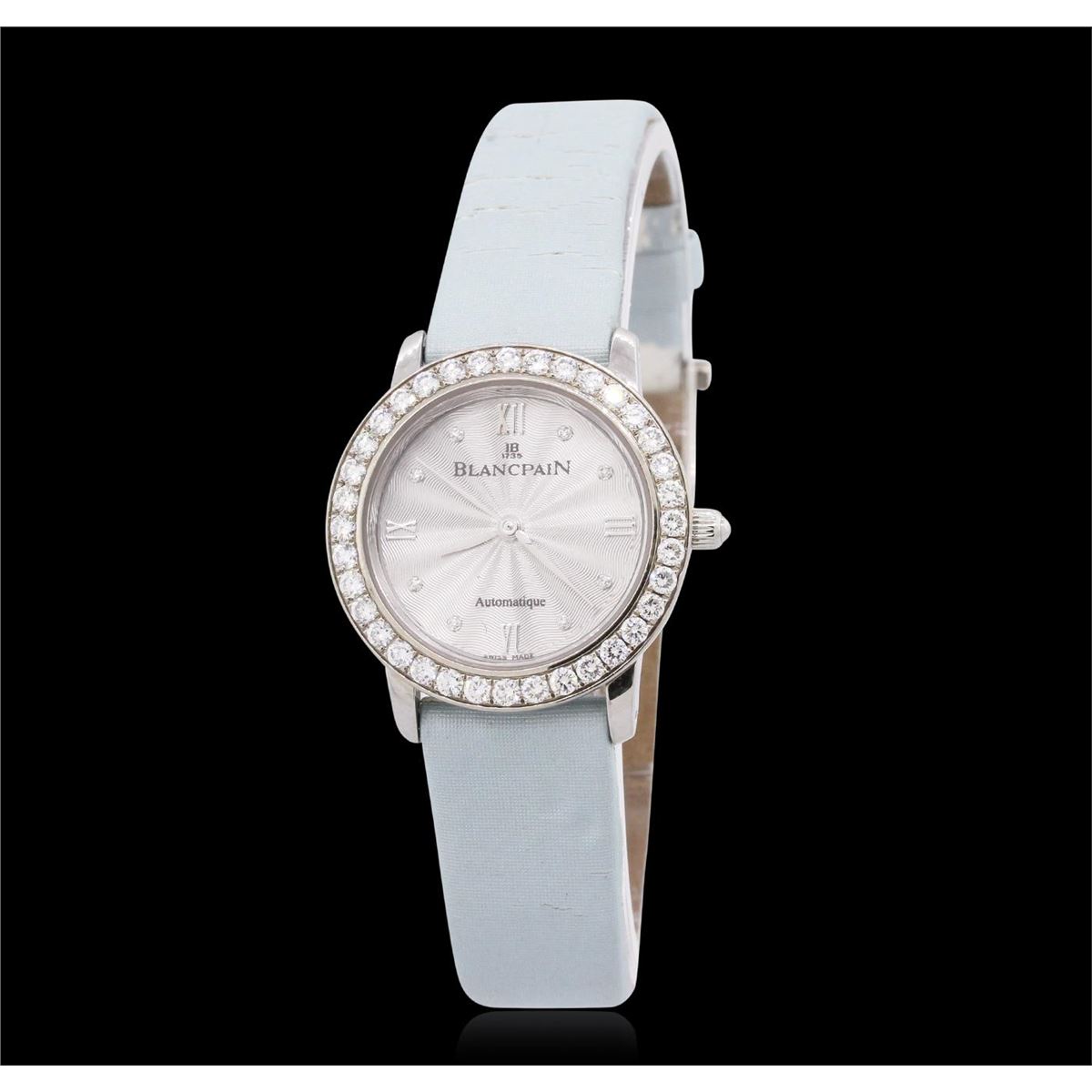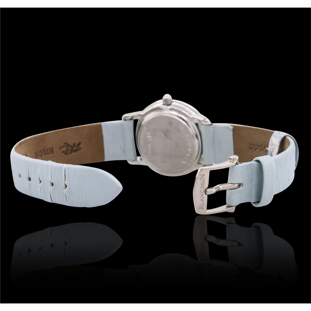 One Blancpain Villeret wristwatch featuring: 18KT White Gold case, crown, lugs, Diamond bezel, blue leather bracelet with buckle, Swiss automatic movement, white mother of pearl dial with analog display, hour and minute hands, Roman numerals, diamond hour markers. This item measures 30mm across, including crown, and weighs a total of 26.60 grams.