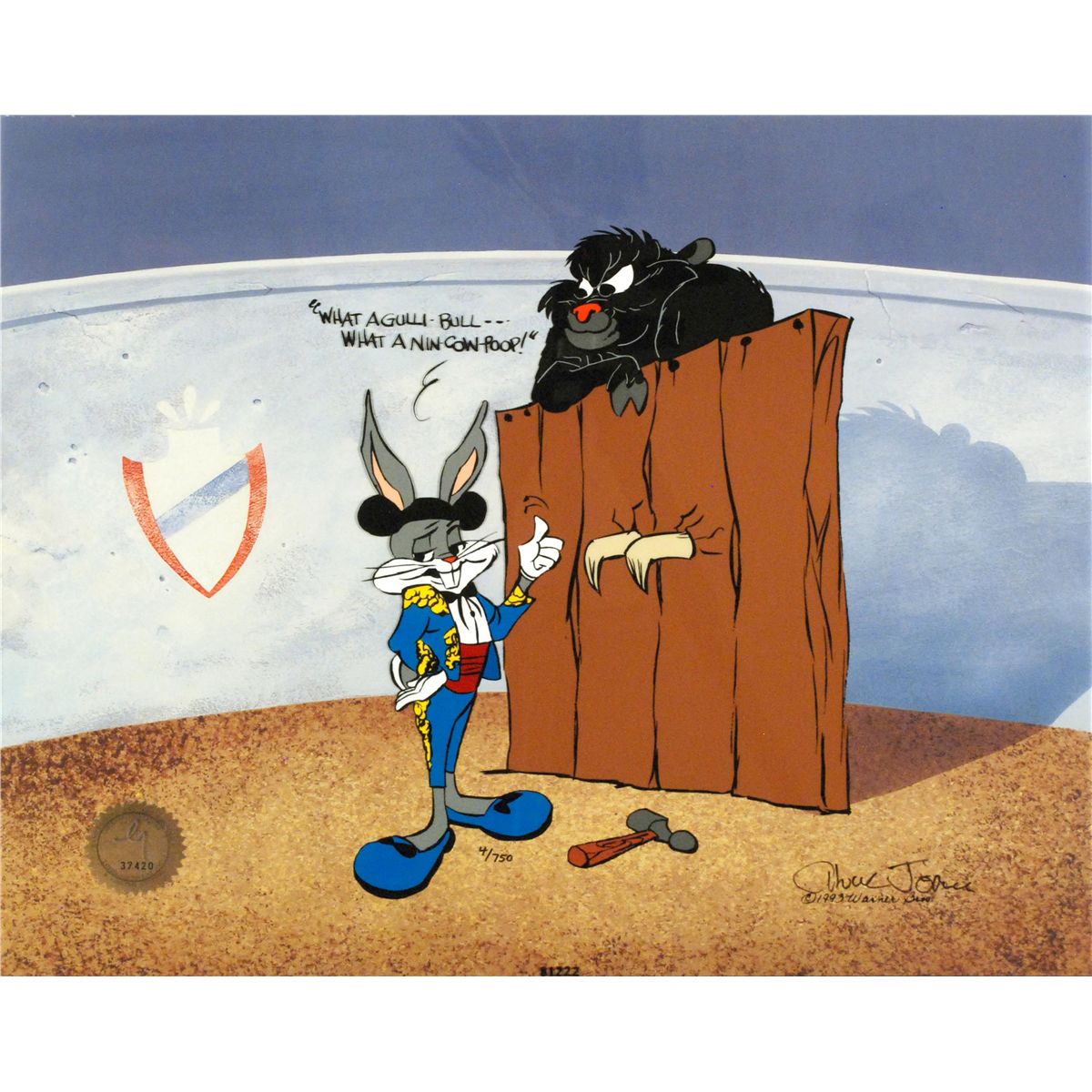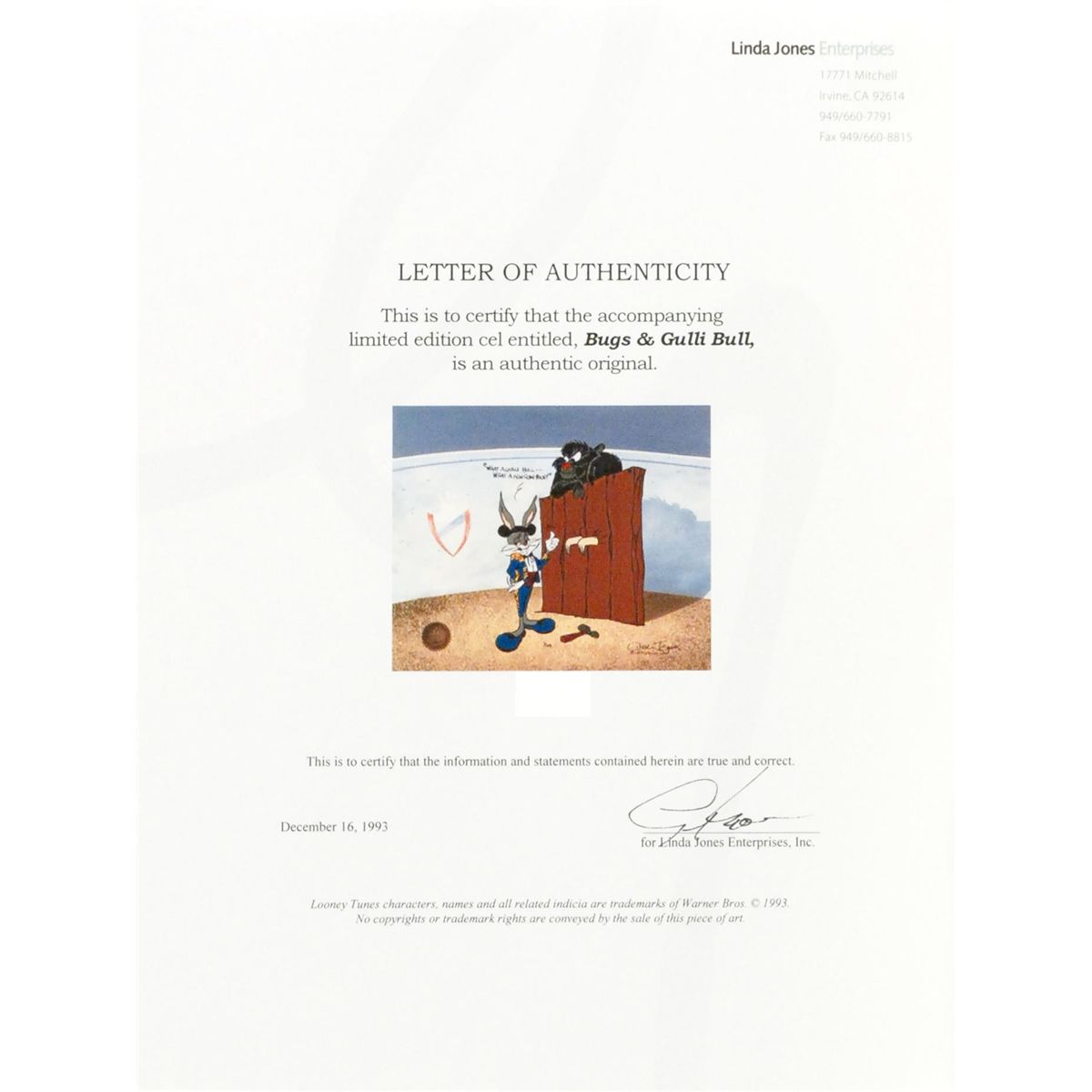 Own this amazing piece based on the original line image hand drawn and hand-inked on paper by Chuck Jones! "Bugs and Gulli-Bull" is a sold out limited edition animation cel with hand painted color on sericel outline, numbered and hand signed by Chuck Jones (1912-2002)! Includes Certificate of Authenticity! Measures approx. 16.5" x 13.5" (image).