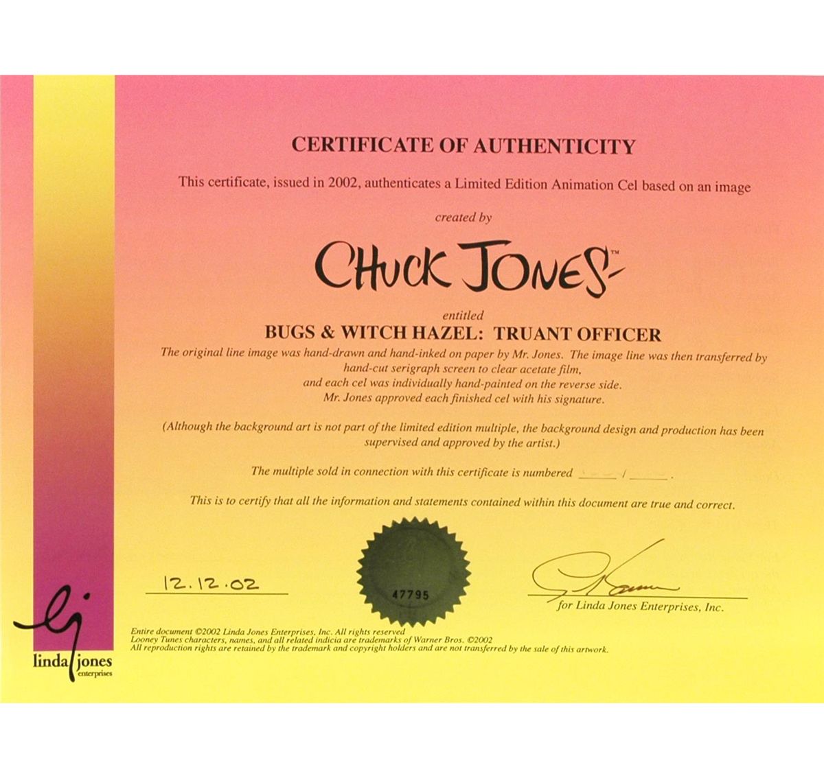 Own this amazing piece based on the original line image hand drawn and hand-inked on paper by Chuck Jones! "Bugs and Witch Hazel: Truant Officer" is a limited edition animation cel from a sold out edition with hand painted coloring on sericel outline, numbered and hand signed by Chuck Jones (1912-2002). Includes Certificate of Authenticity! Measures approx. 16.5" x 13.5" (image).