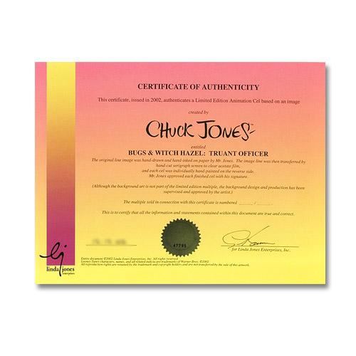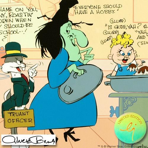 Own this amazing piece based on the original line image hand drawn and hand-inked on paper by Chuck Jones! "Bugs and Witch Hazel: Truant Officer" is a limited edition animation cel from a sold out edition with hand painted coloring on sericel outline, numbered and hand signed by Chuck Jones (1912-2002). Measures approx. 16.5" x 13.5".
