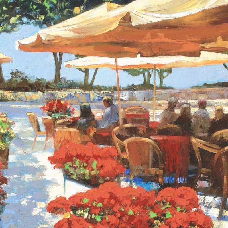 With bright colors and lush textures, Howard Behrens' artwork adds a tropical and exotic feel to any art collection. "Cafe Ravello" is a limited edition hand embellished giclee on canvas. Numbered and hand signed by the artist. Measures approx. 27" x 20"(image).