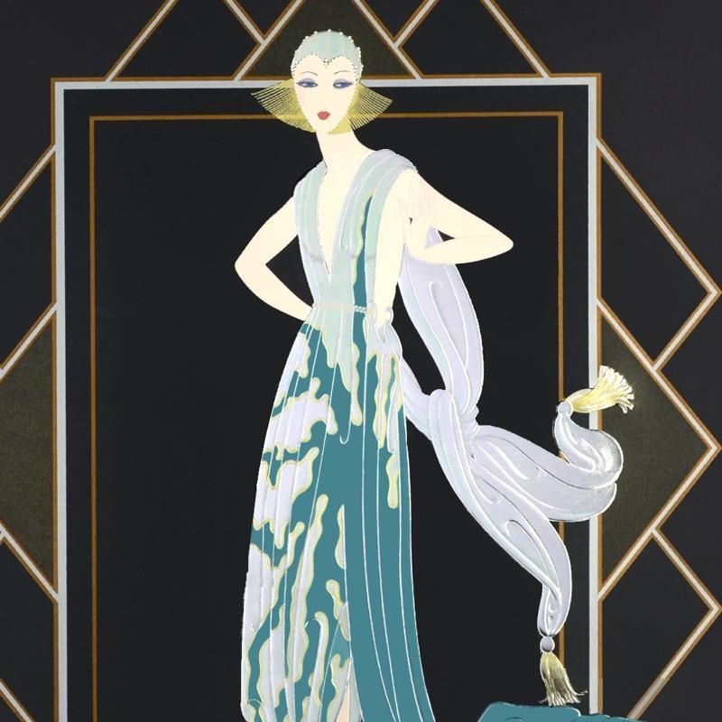 Known as "The Father of Art Deco," Erte (1892-1990) and his immense talent have been recognized by art collectors through the ages. His clean lines and intricate designs are awe-inspiring. "California (Turquoise Dress)" is a limited edition foil embossed serigraph on paper, Roman numbered CCX/CCC and hand signed by Erte! This piece is custom framed using acid free materials and is ready to hang. Measures approx. 37" x 45" (with frame), 26" x 33" (image).