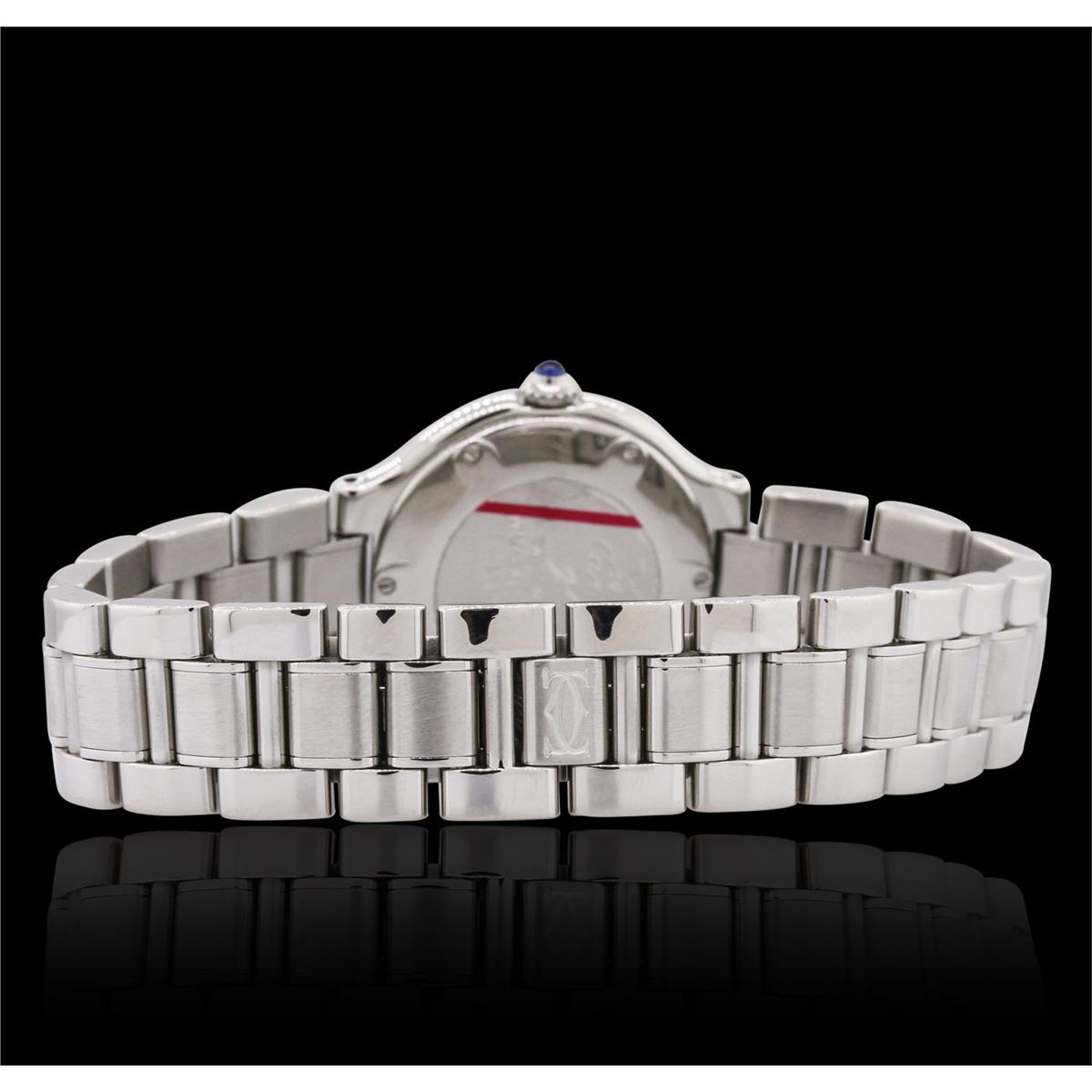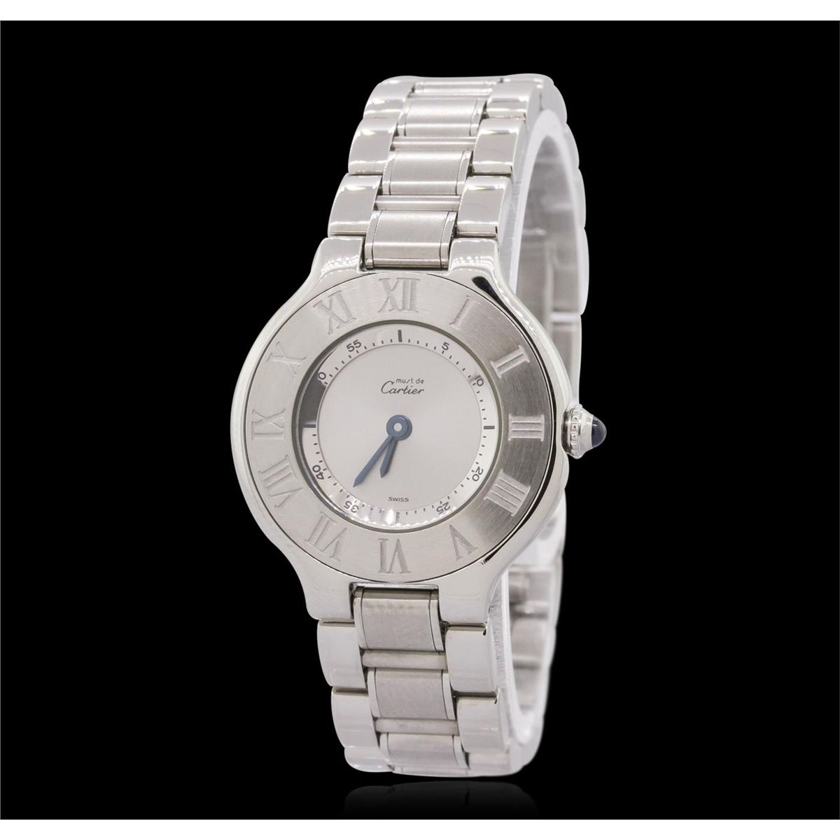 One Cartier Must De 21 wristwatch featuring: Stainless Steel bracelet with deployment clasp, bezel with Roman numerals, case, crown, and lugs, white dial with analog display, Swiss movement, blue hour and minute hands. This item measures 30mm across, including crown, and weighs a total of 61.50 grams.