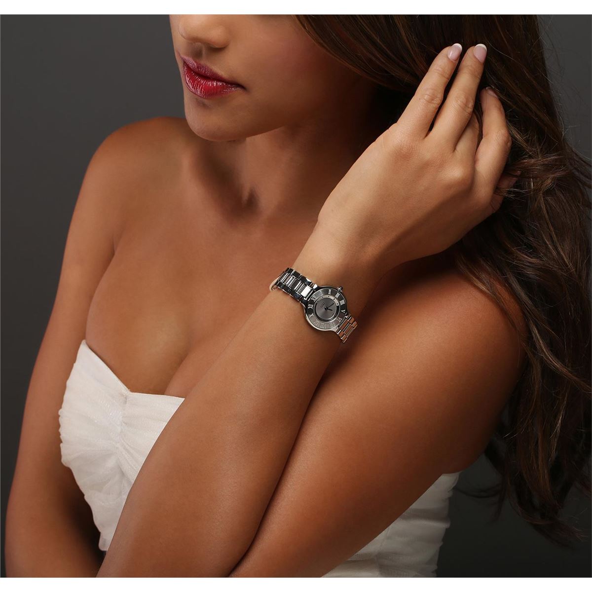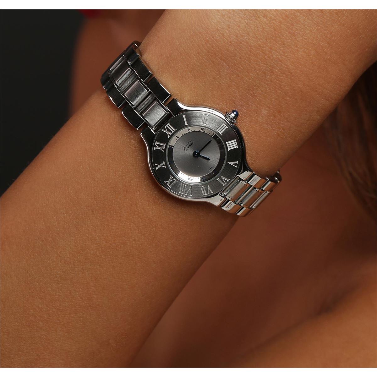 One Cartier Must De 21 wristwatch featuring: Stainless Steel bracelet with deployment clasp, bezel with Roman numerals, case, crown, and lugs, white dial with analog display, Swiss movement, blue hour and minute hands. This item measures 30mm across, including crown, and weighs a total of 61.50 grams.