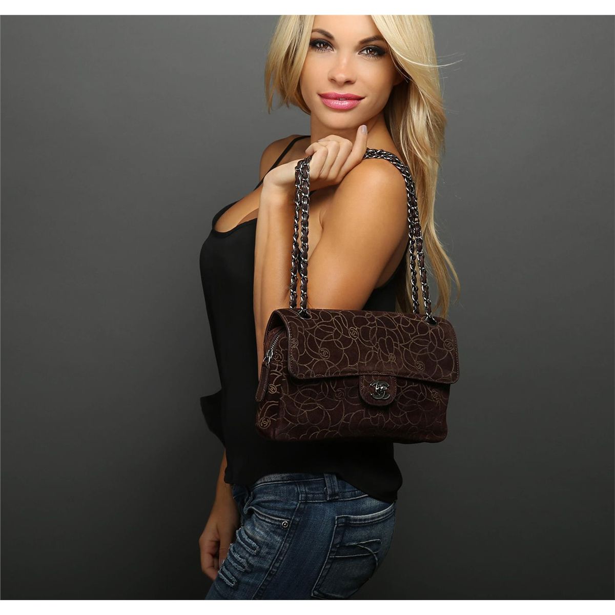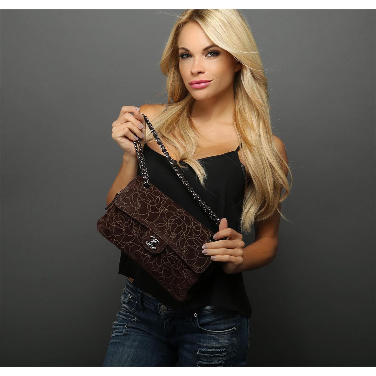 One Chanel maxi flap bag featuring: brown suede, flower print and measures 11.5" x 2.5" x 7". There is a small rip on the inside of the purse.