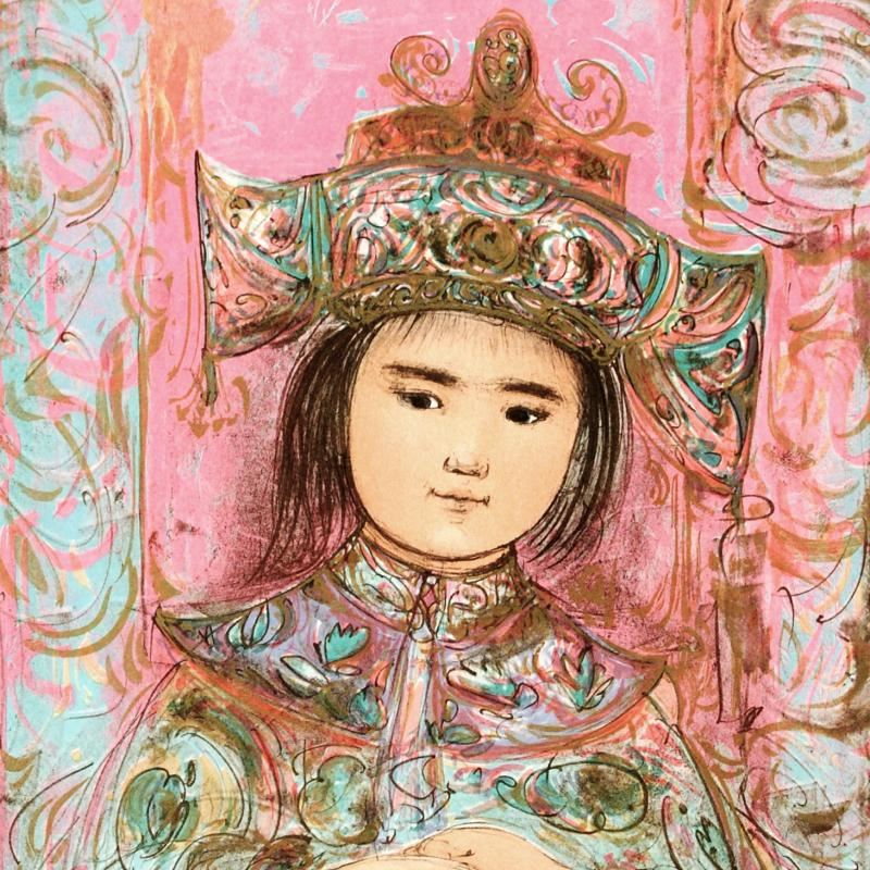 "Child of the East" is a limited edition lithograph on paper, numbered and hand signed by Edna Hibel (1917-2014). Measures approx. 20" x 26" (with border), 13" x 17.5" (image).