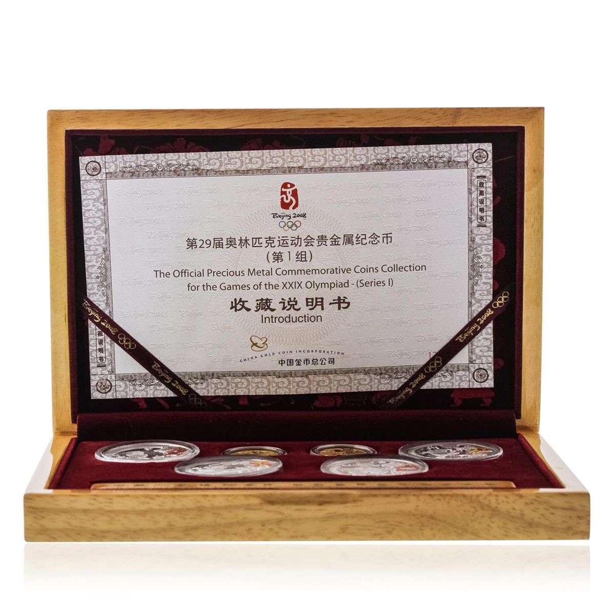 Celebrate the spirit of China and the Beijing Olympics with this ultra limited proof collection. Only 60,000 minted worldwide. This 6 coin set includes two 150 Yuan .9999 gold coins (approx 1/3 oz - .10264 grams) and four 10 Yuan .999 silver (just under 1 oz - .31.103 grams) proof coins from the SECOND series of 2008 Beijing Olympic Commemoratives. An ancient Chinese weightlifting event and an ancient Chinese swimming event are featured on the two Gold Proofs. The four Silver Proofs depict the Great Wall of China, Tower of Buddhist Incense, the courtyard residence in Beijing, and the White Pagoda of Beihai Park in Beijing. These coins are contain the following metal Gold and Silver Denomination: 150 Yuan and 10 Yuan Mintage: 60,000 sets (worldwide) Purity: .999. These are Proof grade coins and this collection is housed in a beautiful finished wood clamshell box and gold container to house the box. A wonderful Chinese collectible from the 2008 Chinese Olympics.
