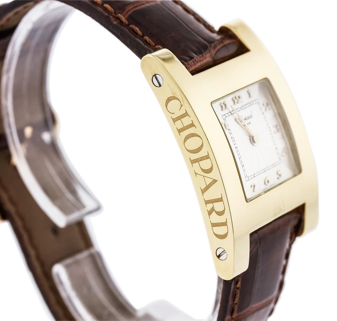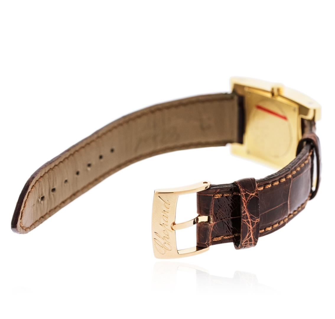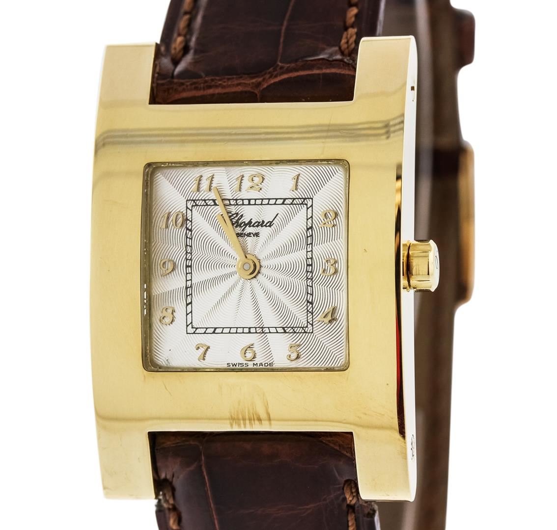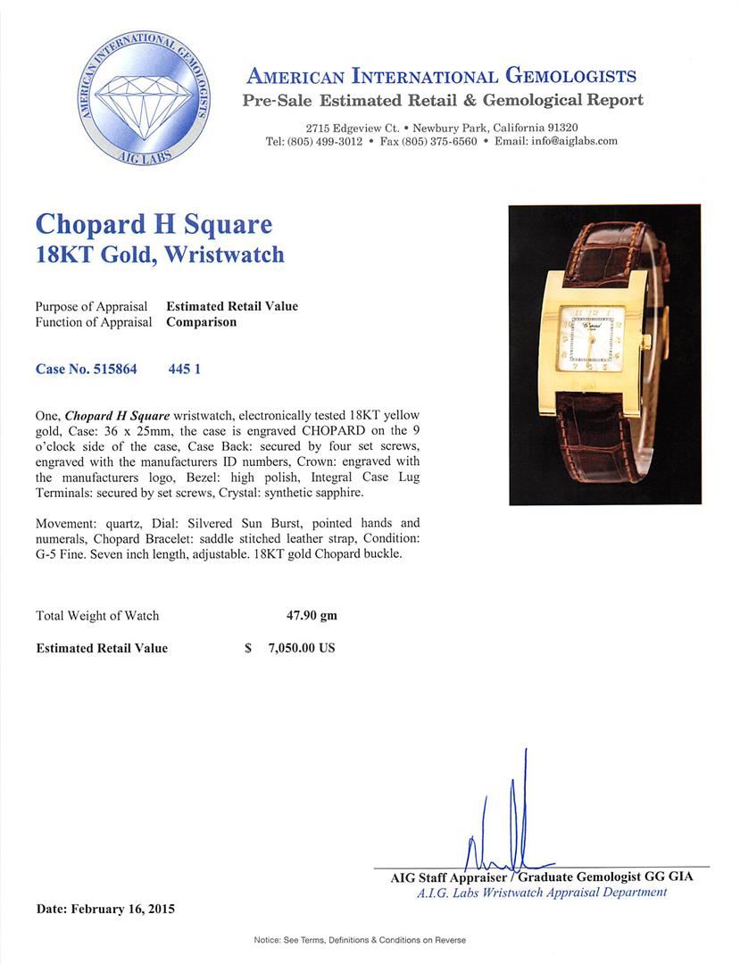 One, Chopard H Square wristwatch, electronically tested 18KT yellow gold, Case: 36 x 25mm, the case is engraved CHOPARD on the 9 o'clock side of the case, Case Back: secured by four set screws, engraved with the manufacturers ID numbers, Crown: engraved with the manufacturers logo, Bezel: high polish, Integral Case Lug Terminals: secured by set screws, Crystal: synthetic sapphire. Movement: quartz, Dial: Silvered Sun Burst, pointed hands and numerals, Chopard Bracelet: saddle stitched leather strap, Condition: G-5 Fine. Seven inch length, adjustable. 18KT gold Chopard buckle. Total Weight of Watch 47.90 grams. AIG Appraised at $7,050.00.