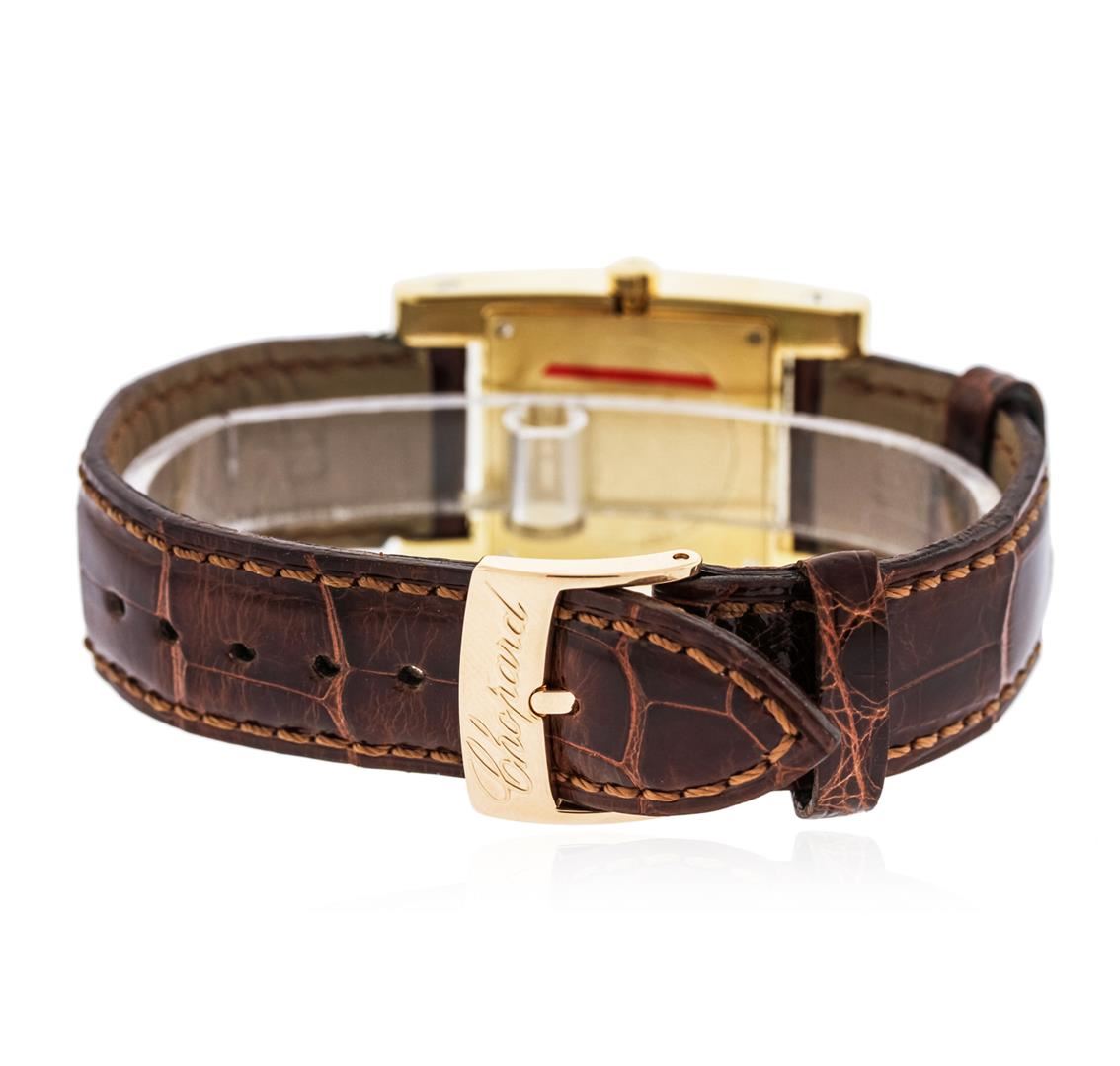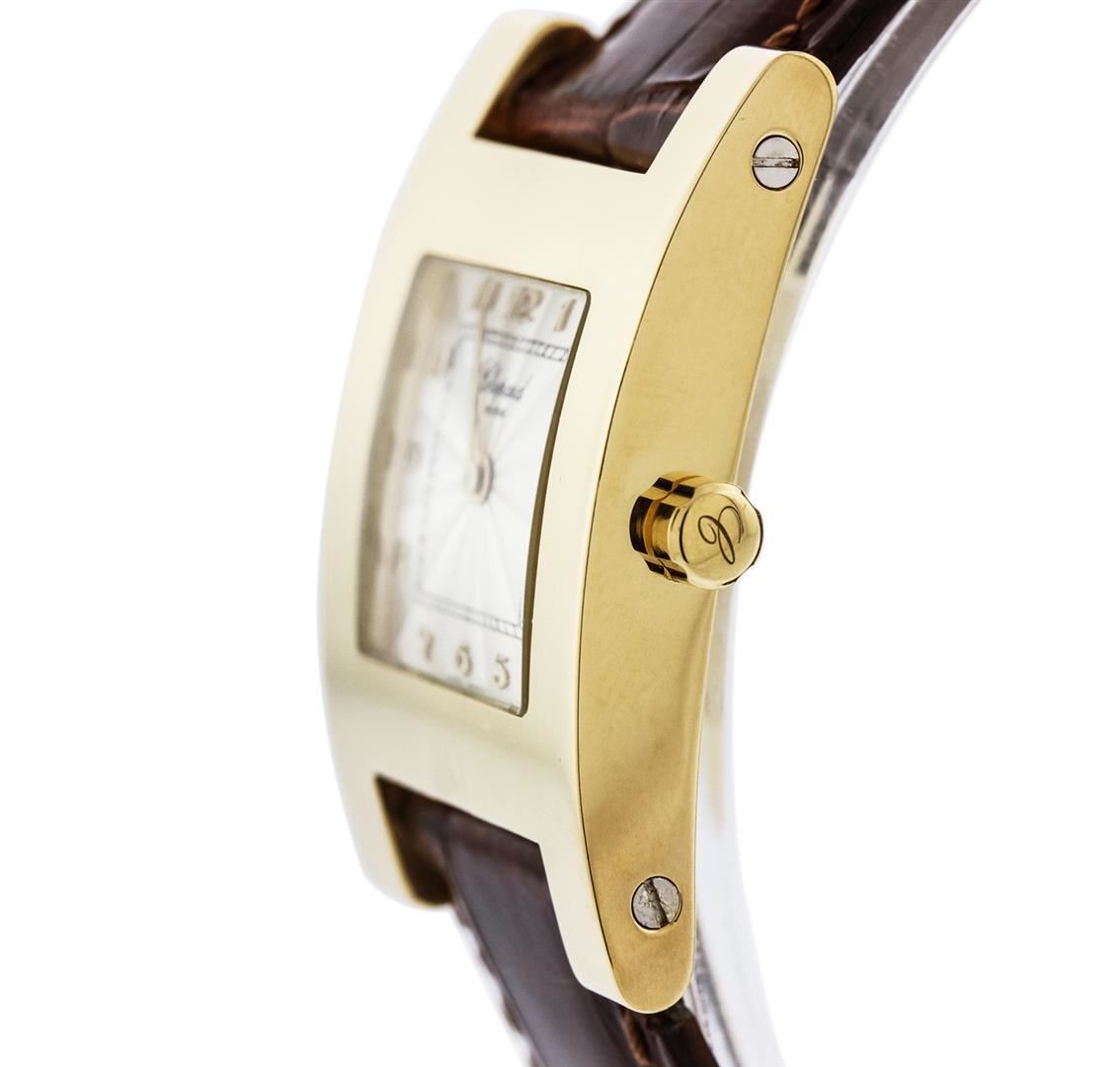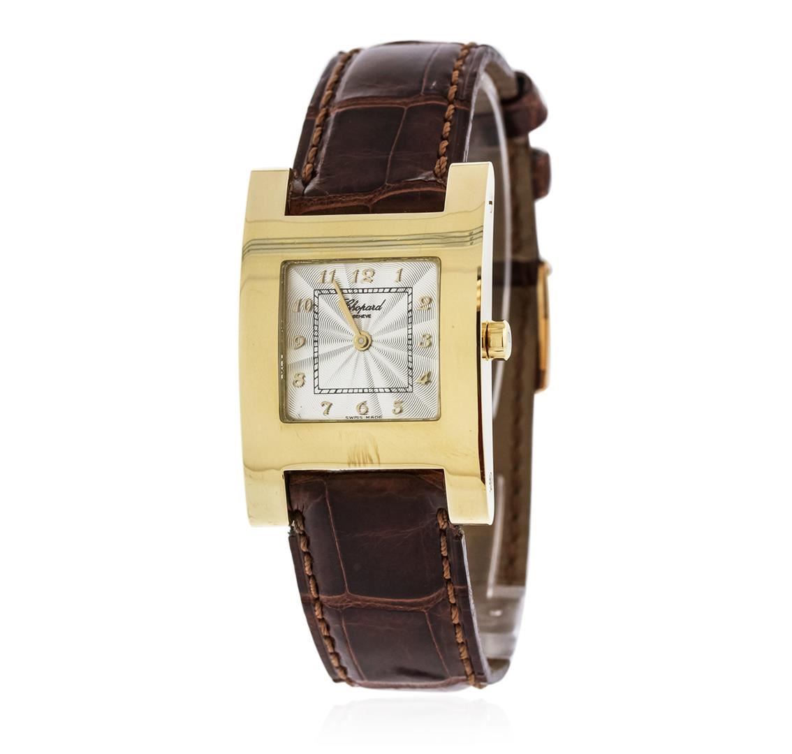 One, Chopard H Square wristwatch, electronically tested 18KT yellow gold, Case: 36 x 25mm, the case is engraved CHOPARD on the 9 o'clock side of the case, Case Back: secured by four set screws, engraved with the manufacturers ID numbers, Crown: engraved with the manufacturers logo, Bezel: high polish, Integral Case Lug Terminals: secured by set screws, Crystal: synthetic sapphire. Movement: quartz, Dial: Silvered Sun Burst, pointed hands and numerals, Chopard Bracelet: saddle stitched leather strap, Condition: G-5 Fine. Seven inch length, adjustable. 18KT gold Chopard buckle. Total Weight of Watch 47.90 grams. AIG Appraised at $7,050.00.
