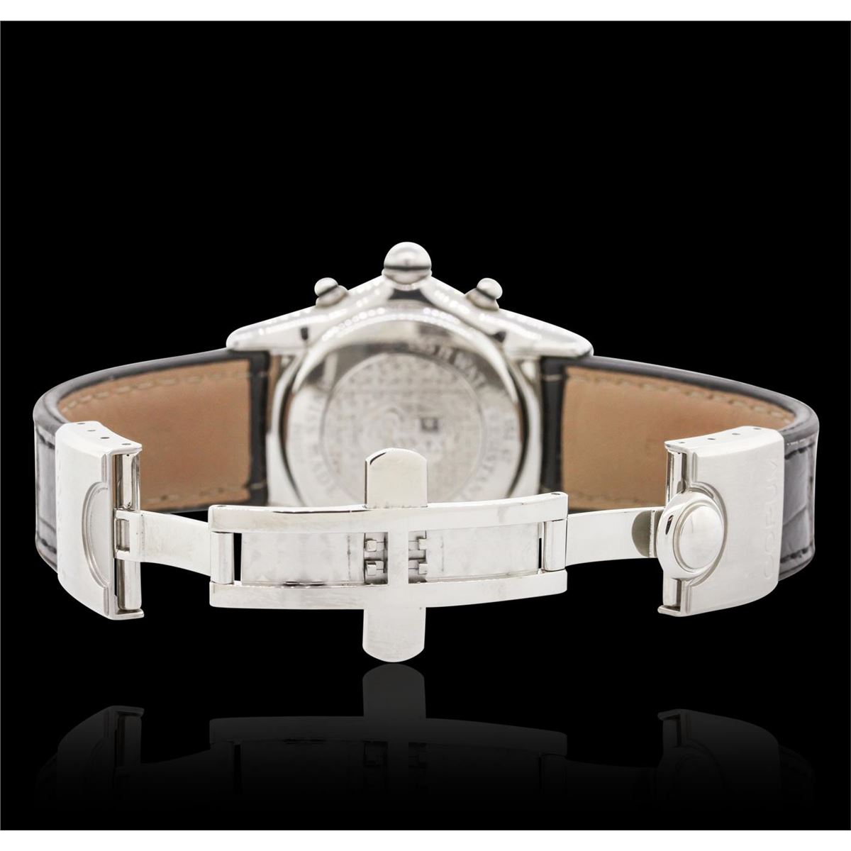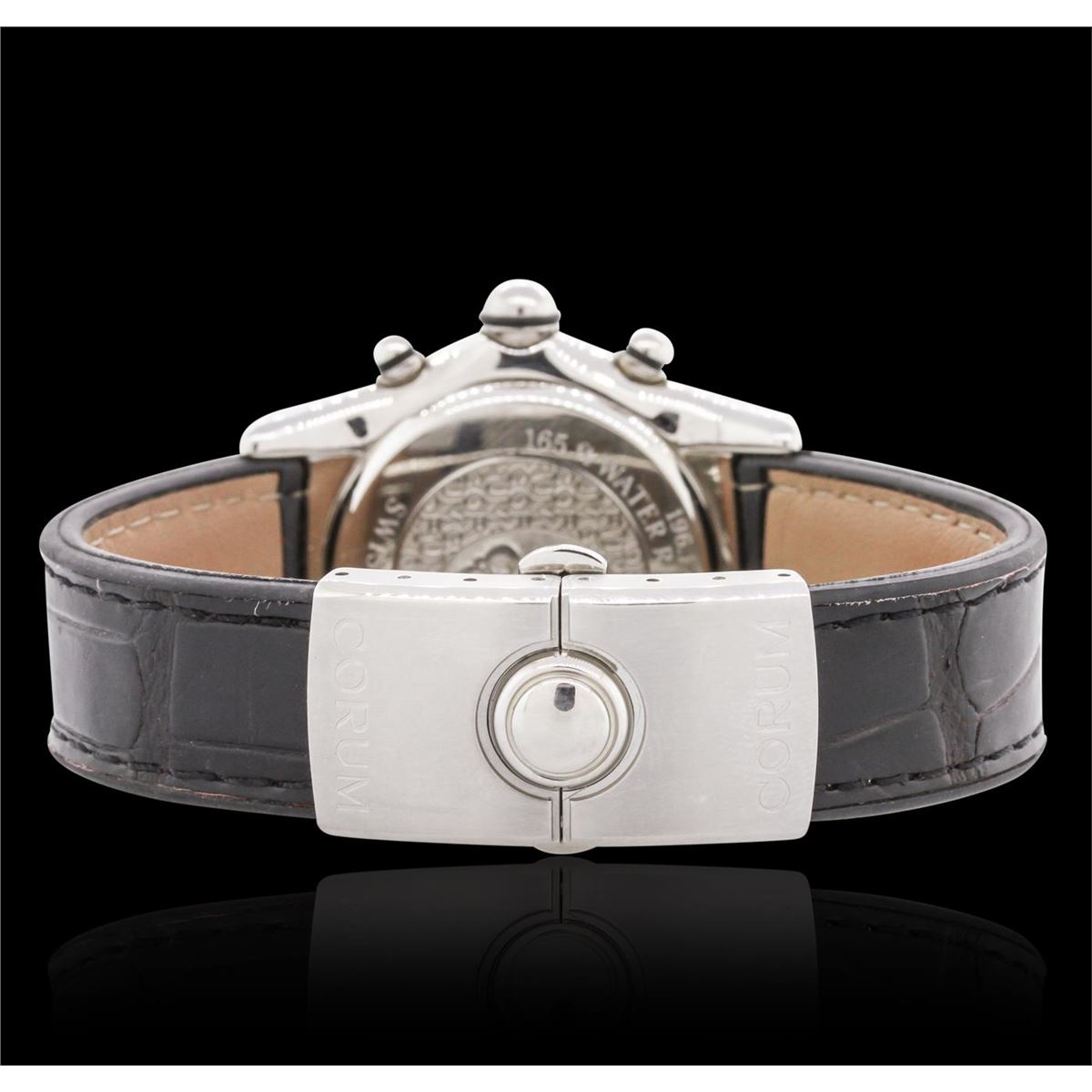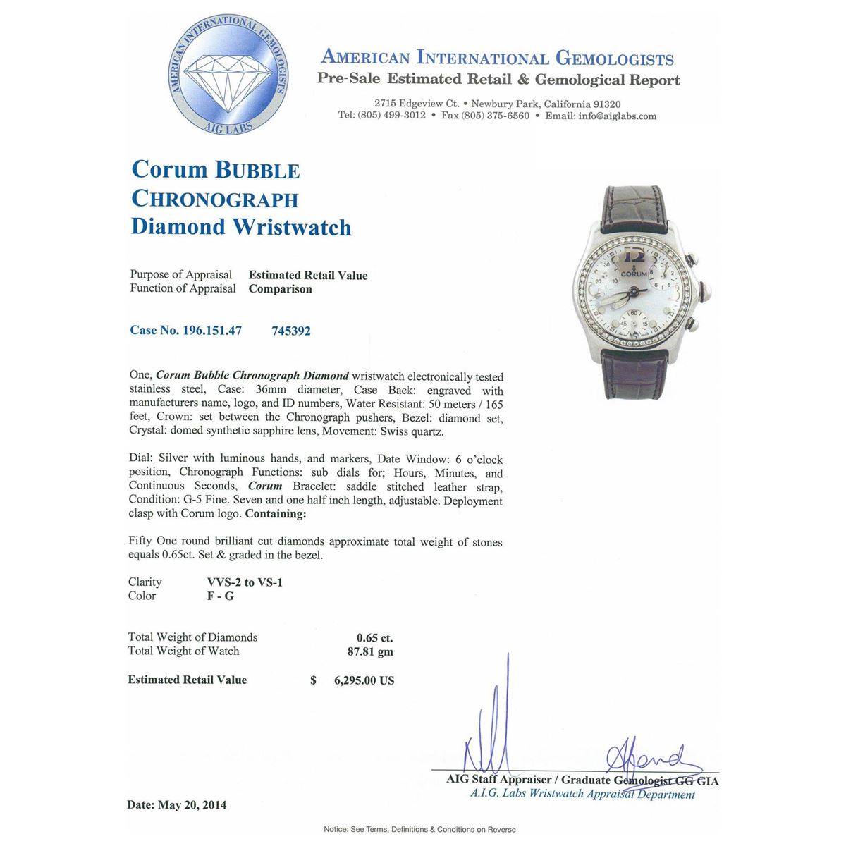 One, Corum Bubble Chronograph Diamond wristwatch electronically tested stainless steel, Case: 36mm diameter, Case Back: engraved with manufacturers name, logo, and ID numbers, Water Resistant: 50 meters / 165 feet, Crown: set between the Chronograph pushers, Bezel: diamond set, Crystal: domed synthetic sapphire lens, Movement: Swiss quartz. Dial: Silver with luminous hands, and markers, Date Window: 6 o'clock position, Chronograph Functions: sub dials for; Hours, Minutes, and Continuous Seconds, Corum Bracelet: saddle stitched leather strap, Condition: G-5 Fine. Seven and one half inch length, adjustable. Deployment clasp with Corum logo. Containing: Fifty One round brilliant cut diamonds approximate. Total Weight of stones equals 0.65ct. Set & graded in the bezel. Clarity: VVS-2 to VS-1. Color: F - G. Total Weight of Diamonds 0.65ct. Total Weight of Watch 87.81 grams. AIG Appraised at $6,295.00.