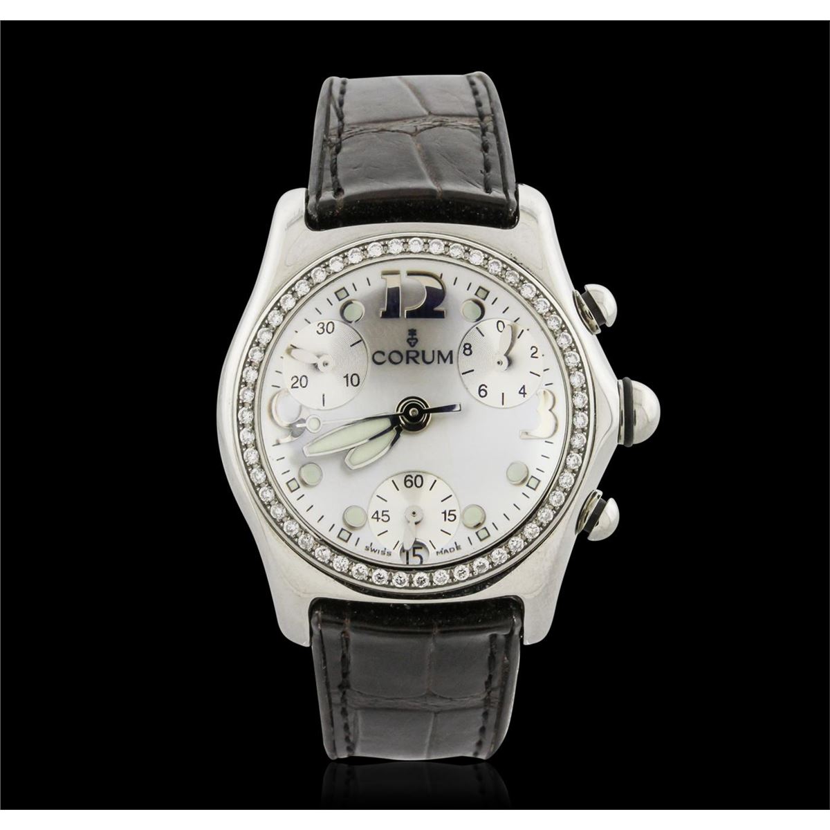 One, Corum Bubble Chronograph Diamond wristwatch electronically tested stainless steel, Case: 36mm diameter, Case Back: engraved with manufacturers name, logo, and ID numbers, Water Resistant: 50 meters / 165 feet, Crown: set between the Chronograph pushers, Bezel: diamond set, Crystal: domed synthetic sapphire lens, Movement: Swiss quartz. Dial: Silver with luminous hands, and markers, Date Window: 6 o'clock position, Chronograph Functions: sub dials for; Hours, Minutes, and Continuous Seconds, Corum Bracelet: saddle stitched leather strap, Condition: G-5 Fine. Seven and one half inch length, adjustable. Deployment clasp with Corum logo. Containing: Fifty One round brilliant cut diamonds approximate. Total Weight of stones equals 0.65ct. Set & graded in the bezel. Clarity: VVS-2 to VS-1. Color: F - G. Total Weight of Diamonds 0.65ct. Total Weight of Watch 87.81 grams. AIG Appraised at $6,295.00.