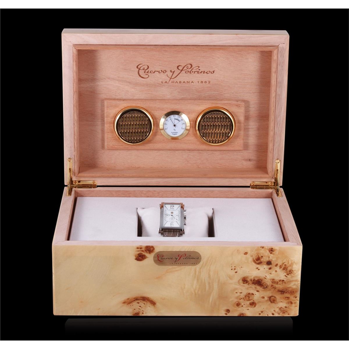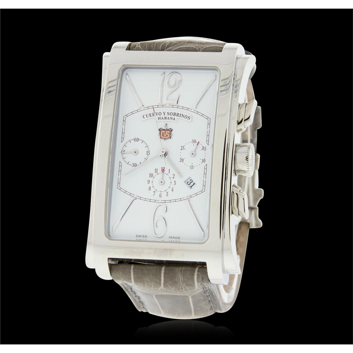 One Cuervo y Sobrinos A 1014 Prominente Cronografo Stainless Steel Wristwatch featuring: stainless steel case 32mm wide without the crown, and 12mm thick, brown leather band, cream dial, automatic movement, stainless steel butterfly clasp, stainless steel crown, and sapphire crystal.