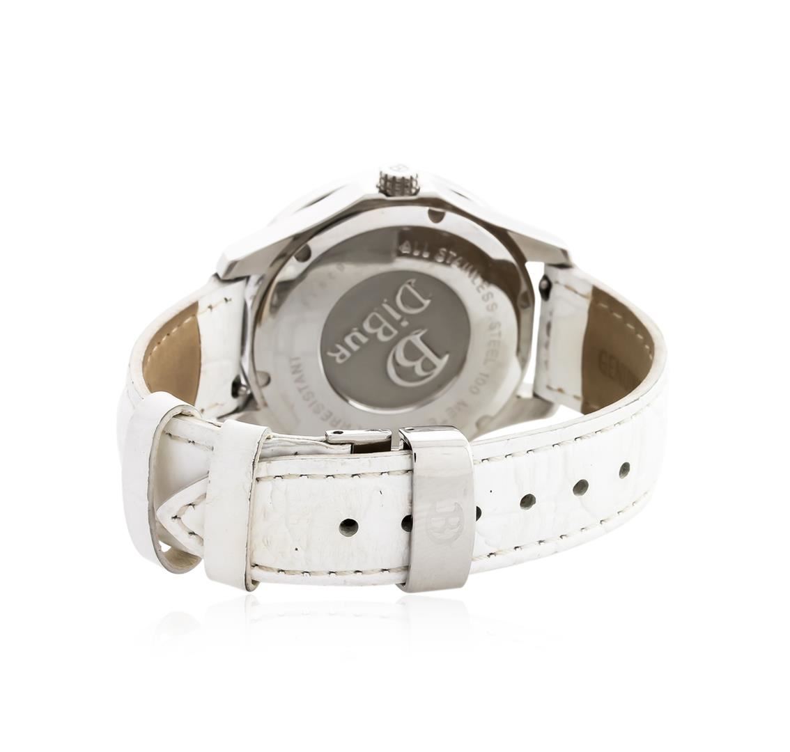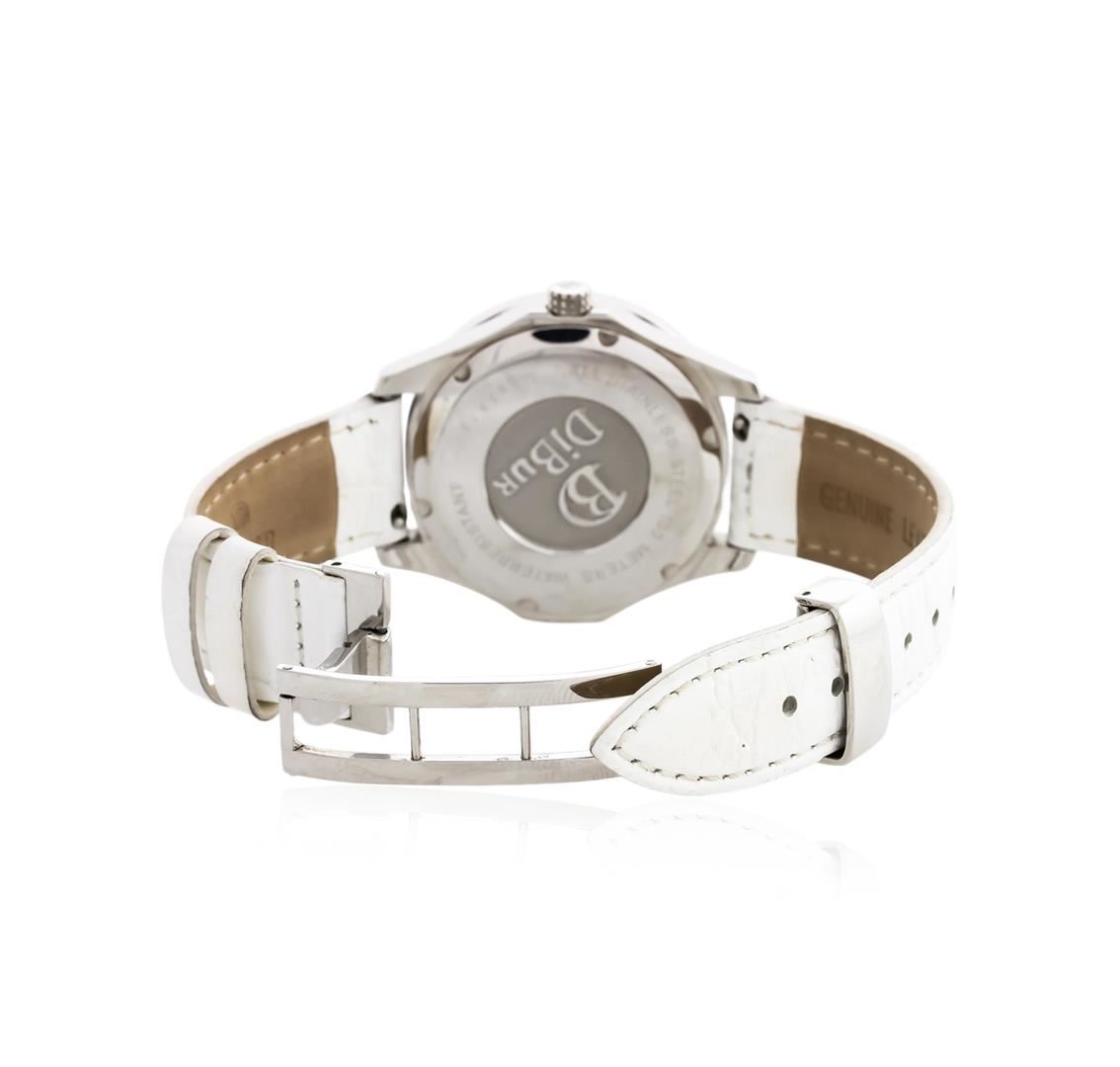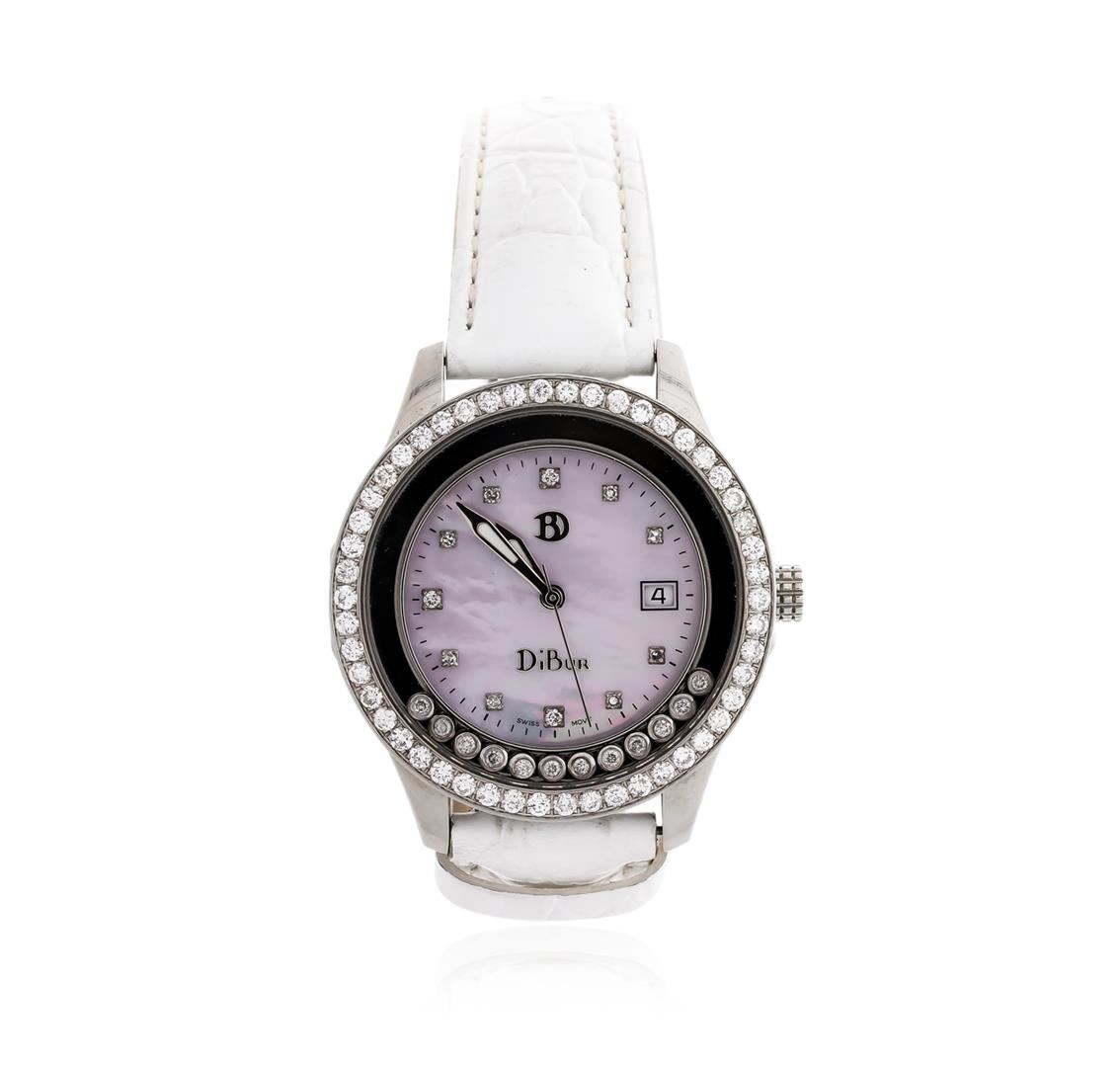 One DiBur wristwatch featuring: Case: Stainless steel. Crown: Stainless steel. Bezel: Stainless steel set with diamonds. Dial: Mother of pearl with luminous hour/minute hands. The dial also features diamond hour markers and floating diamonds around the perimeter. Date window at the 3 o'clock position. Bracelet: Leather. Water resistant: 100 meters.