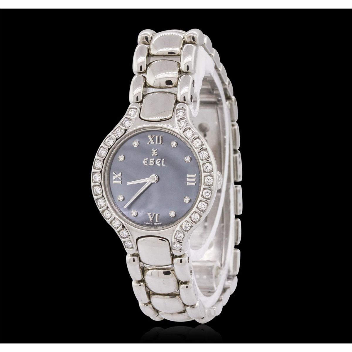 One Ebel Beluga wristwatch featuring: Swiss movement, Stainless Steel case, crown, lugs, and bracelet with deployment clasp, Diamond bezel, black mother of pearl dial with analog display, roman numerals, hour markers, hour and minute hands. This item measures 25mm across, including crown, and weighs a total of 44.00 grams.