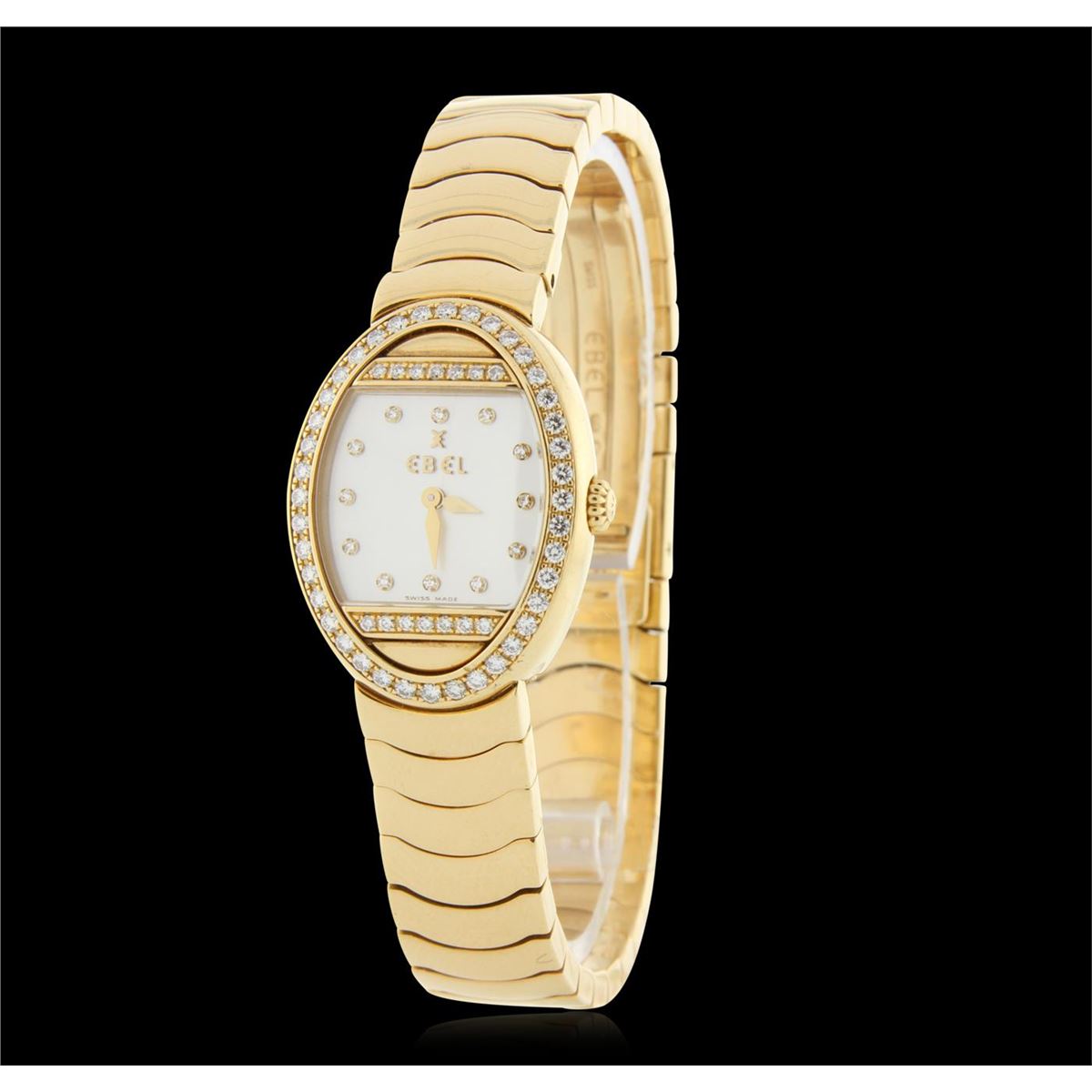 One Ebel Satya Yellow Gold Diamond Wristwatch featuring: White mother of pearl Diamond Dial & Bezel, 18KT Yellow Gold Case 22.5mm wide, 29mm long, 8mm thick, Back Screw-In Closed Case, 18KT Yellow Gold Bracelet 12 mm wide, with Type Fold-Over Clasp, fitting wrist sizes up to 7.5 inches, Pull and Push Fluted Crown, Gold Tone Hand Indicators, 12 Diamond Hour Markers, Scratch-Resistant Sapphire Crystal, Battery Powered Swiss Quartz Movement. Water Resistant to 30 m / 100 ft.