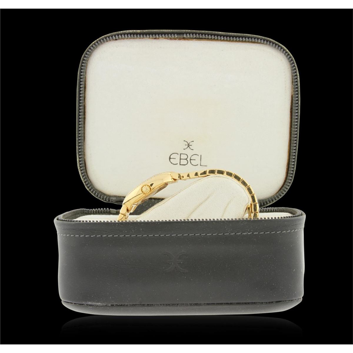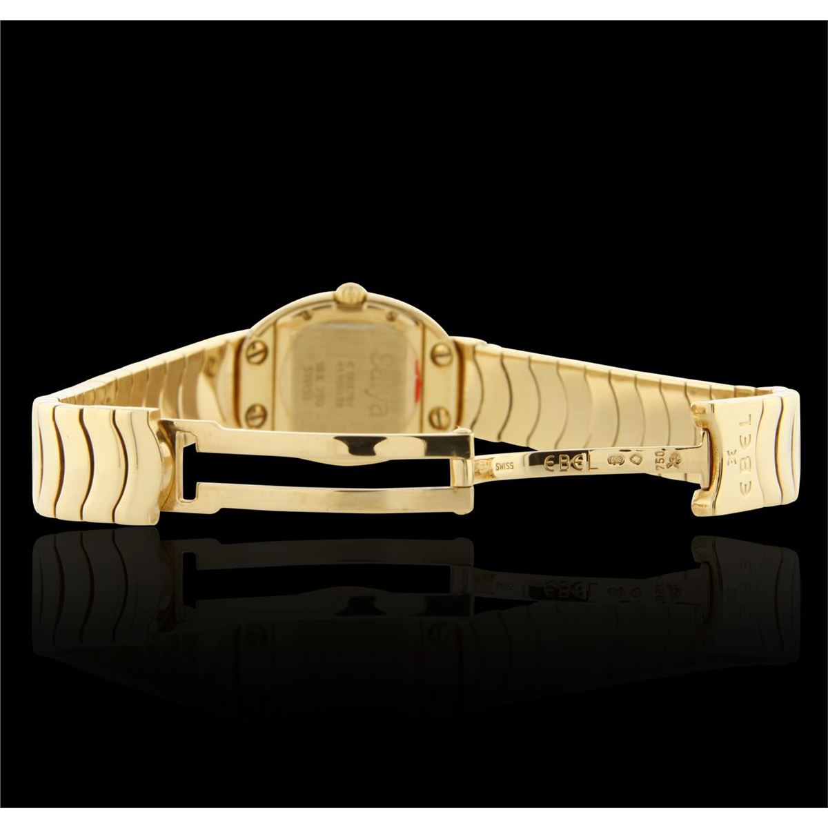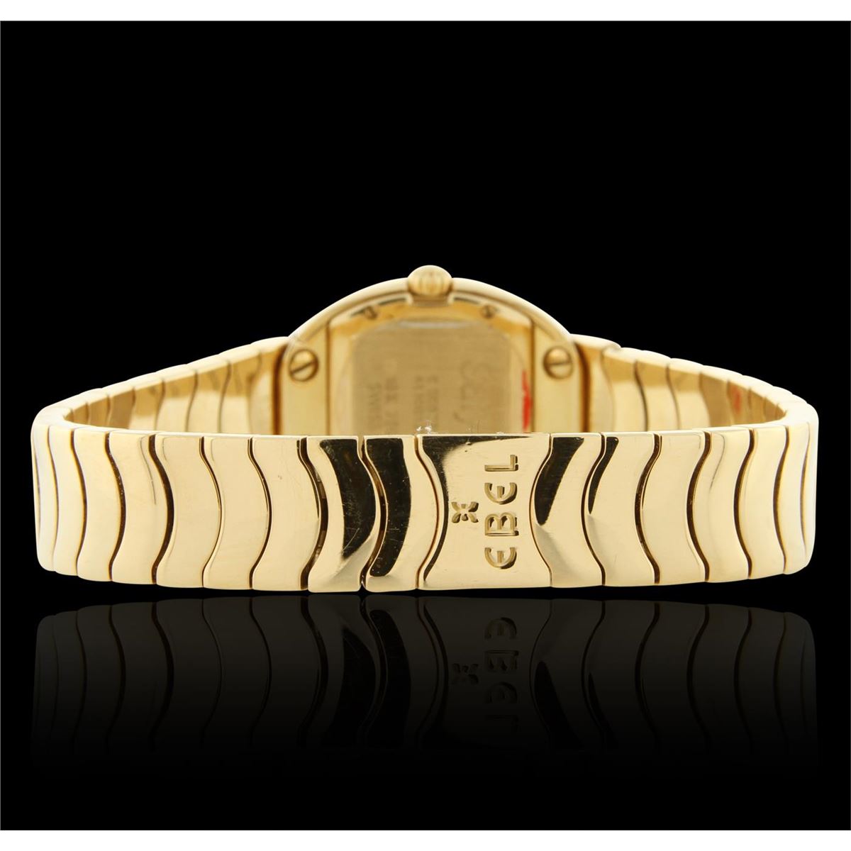 One Ebel Satya Yellow Gold Diamond Wristwatch featuring: White mother of pearl Diamond Dial & Bezel, 18KT Yellow Gold Case 22.5mm wide, 29mm long, 8mm thick, Back Screw-In Closed Case, 18KT Yellow Gold Bracelet 12 mm wide, with Type Fold-Over Clasp, fitting wrist sizes up to 7.5 inches, Pull and Push Fluted Crown, Gold Tone Hand Indicators, 12 Diamond Hour Markers, Scratch-Resistant Sapphire Crystal, Battery Powered Swiss Quartz Movement. Water Resistant to 30 m / 100 ft.