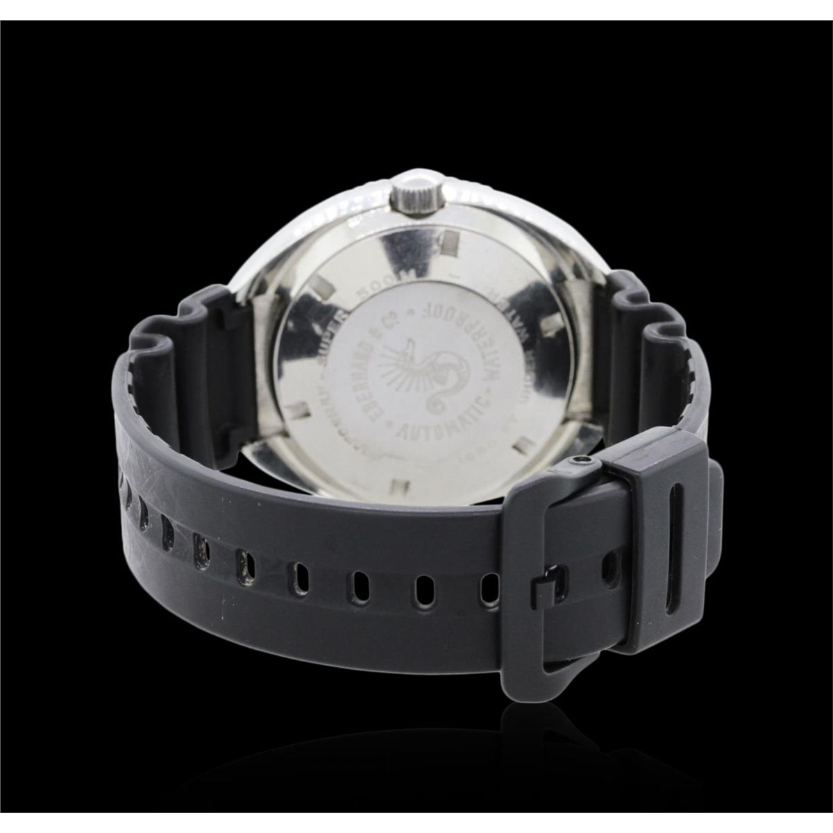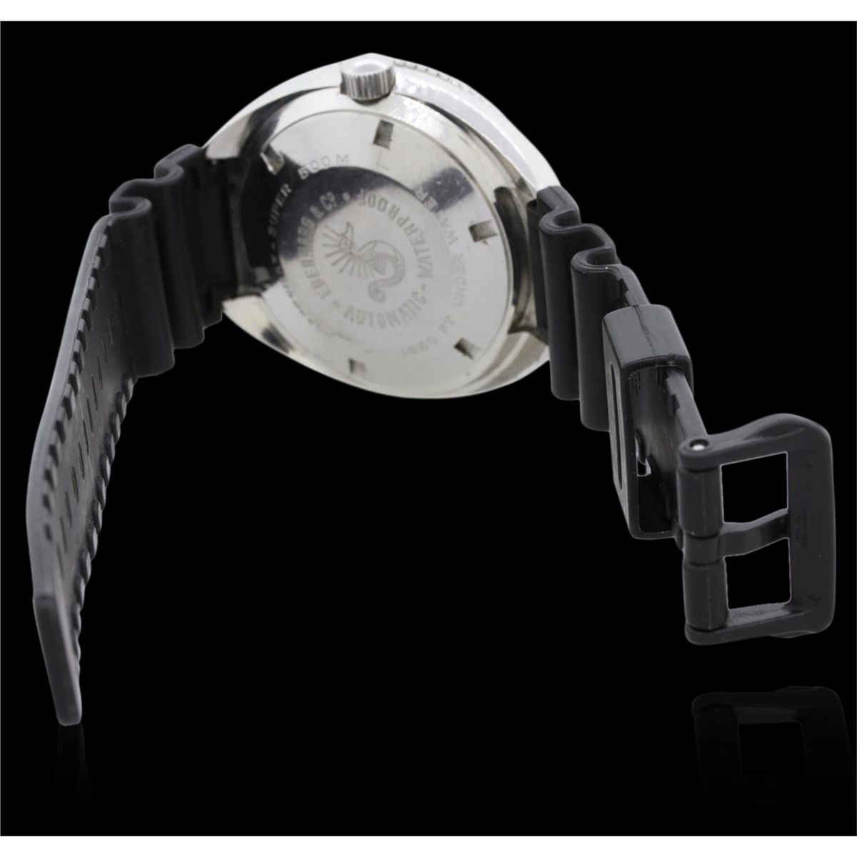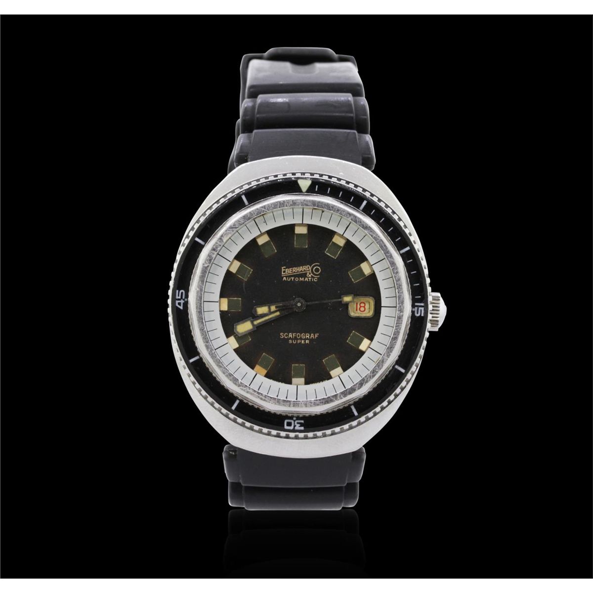 One Eberhard & Co. Scafograf Super divers wristwatch featuring: Case: stainless steel. Crown: screw down stainless steel. Bezel: black insert, rotating for up to sixty minute time lapse. Dial: black with luminous hour, minute, and second hands. Date window at the 3 o'clock position. Band: black resin with black buckle clasp. Water resistant: 500 meters / 1650 feet.