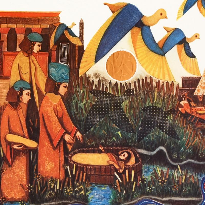 "Egyptians Embrace" is a limited edition embossed lithograph on paper, numbered and hand signed by Amram Ebgi. Measures approx. 19" x 14" (with border), 16" x 9.5" (image).