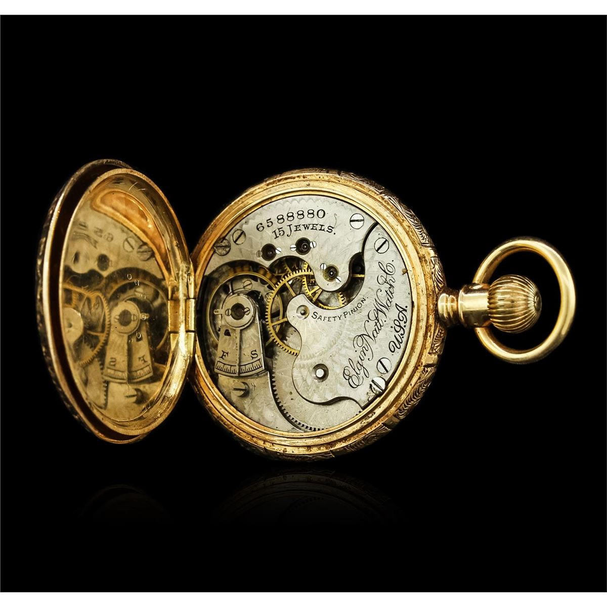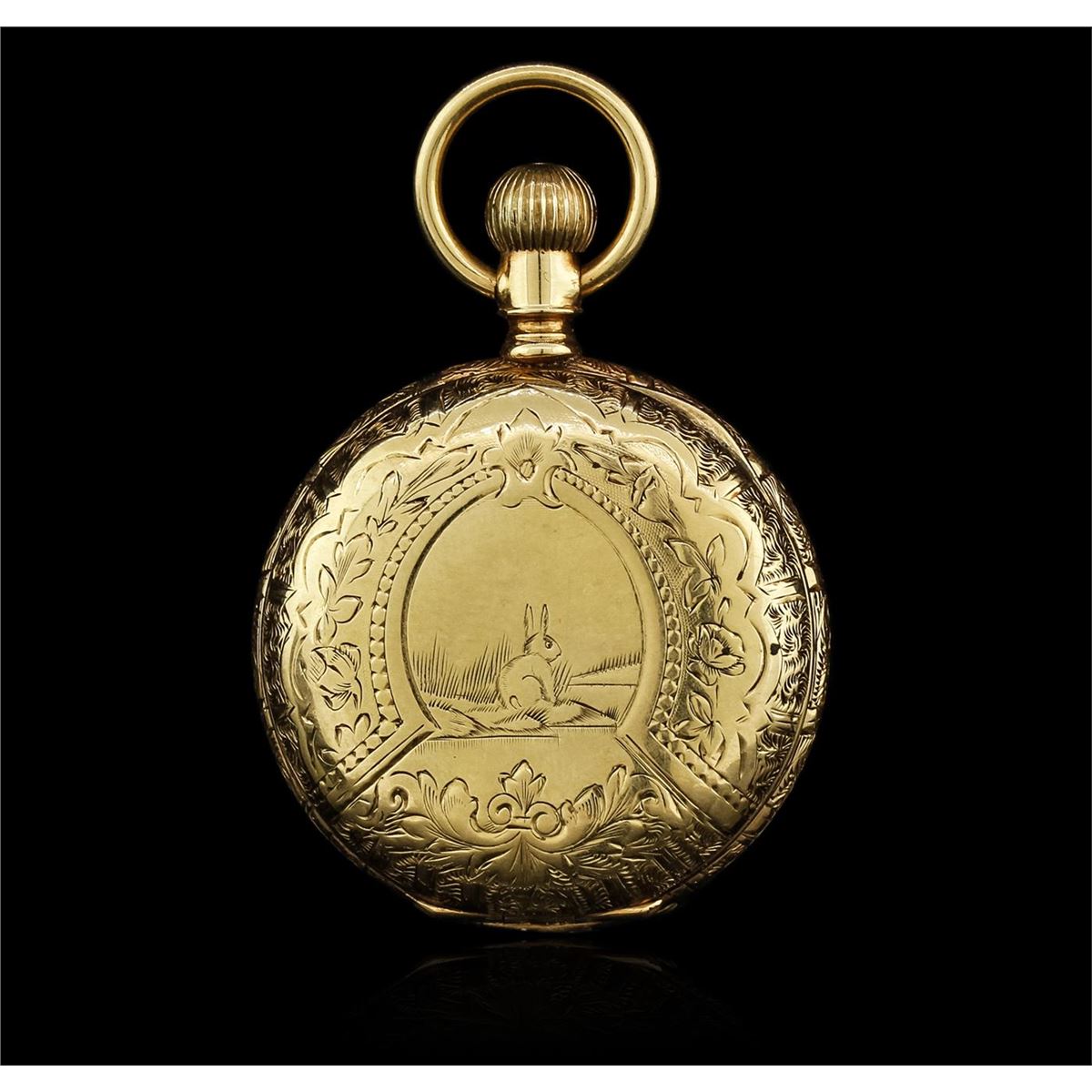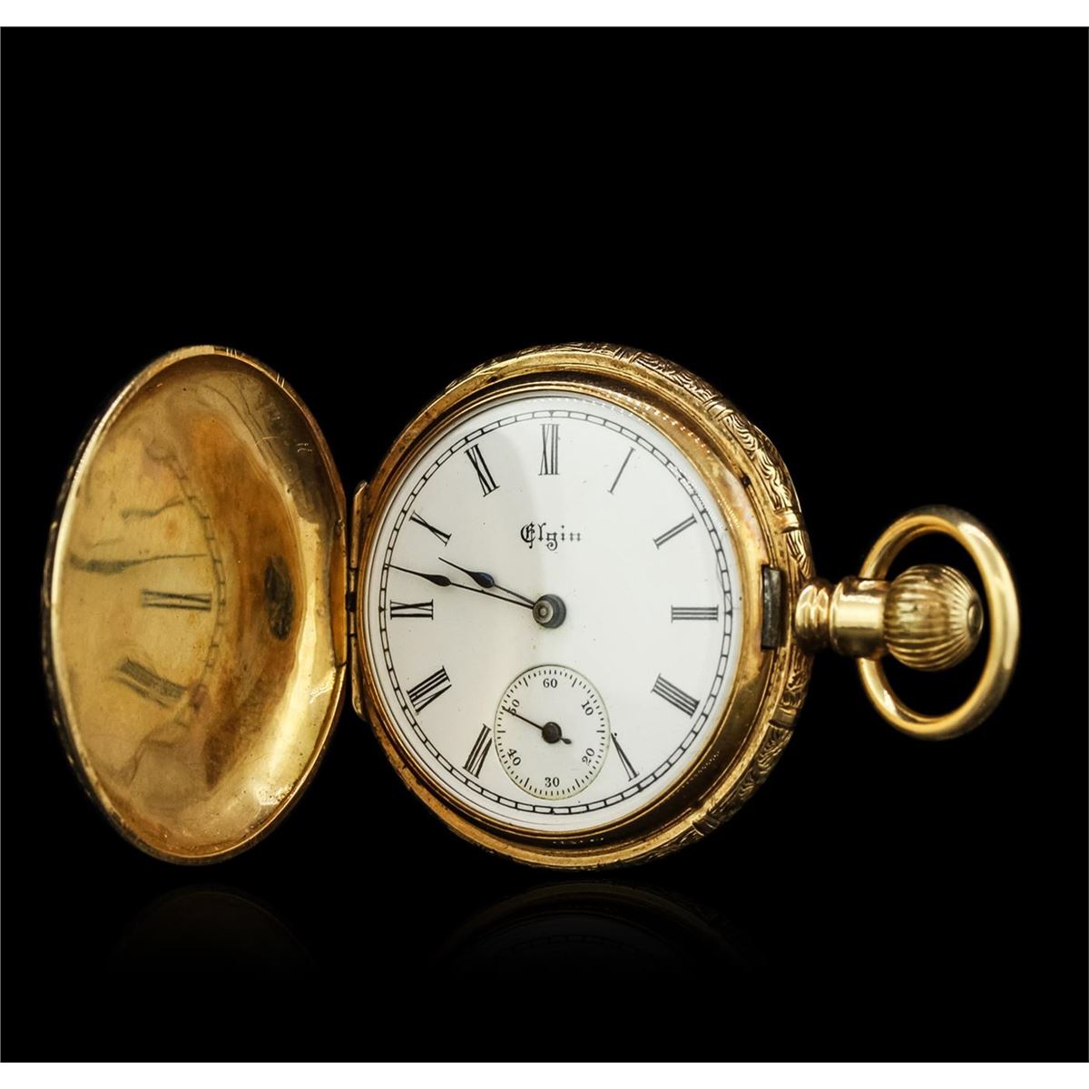 One, antique Elgin full hunter case, pocket watch electronically tested 14KT yellow gold-filled, Case: 35mm, Dial Case Cover: ornate floral pattern with a raised central section available for engraving, Inner Movement Case Cover: polished, Outer Movement Case Cover: stamped "Warranted 14K U.S. Assay", on the inside, the obverse side is completed with a raised floral scene, framing a lone Rabbit in a meadow, Bezel: polished, Crystal: acrylic. Circa: 1897 Movement: Elgin USA fifteen jewel mechanical stem wind, Signed Dial: White, pointed hands and Roman numerals, Subsidiary Second's Sub Dial: at the 6 o'clock position, Condition: G-4 Average. Total Weight of Watch 36.59 grams. AIG Appraised at $2,150.00.