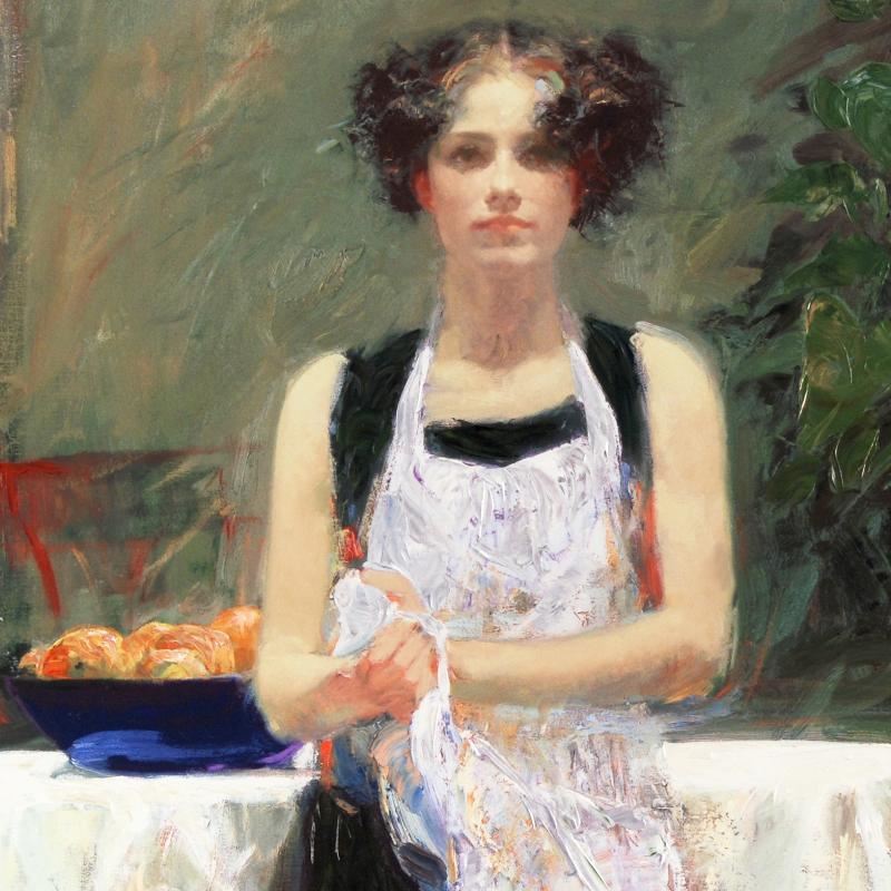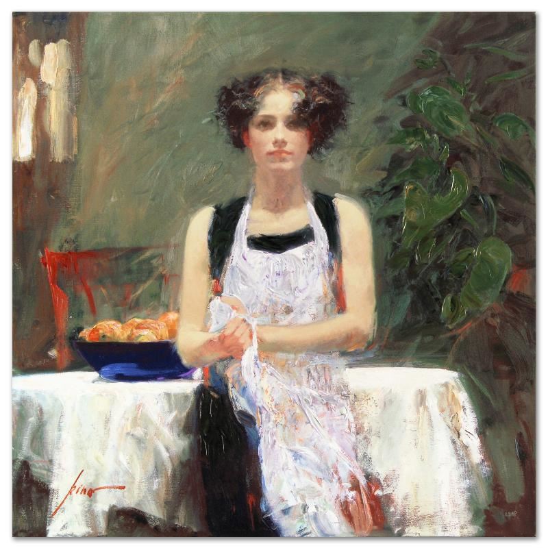 Pino's portraits allow glimpses into intensely personal, intimate spaces, conveying emotion through rich, warm color and sensual brushwork. "Ester" is a limited edition giclee on stretched canvas that has been hand-embellished by Pino himself, AP numbered and hand signed by Pino (1939-2010). Measures approx. 28" x 28" (image).