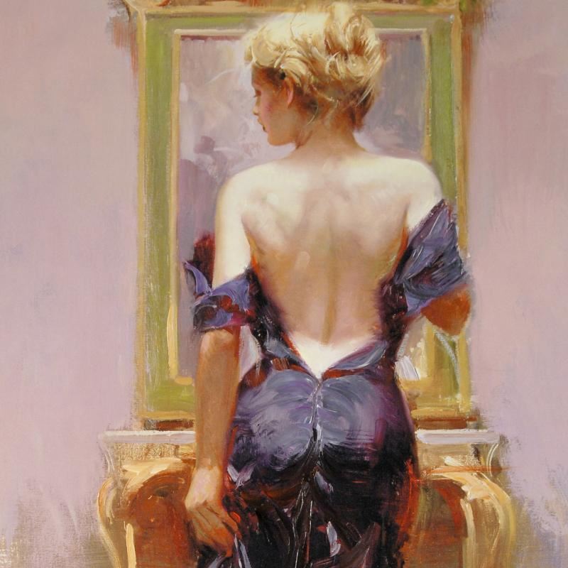 Pino's portraits allow glimpses into intensely personal, intimate spaces, conveying emotion through rich, warm color and sensual brushwork. "Evening Elegance" is a limited edition giclee on stretched canvas that has been hand-embellished by Pino himself, AP numbered 6 out of 95 and hand signed by Pino (1939-2010). Measures approx. 24" x 40" (image).