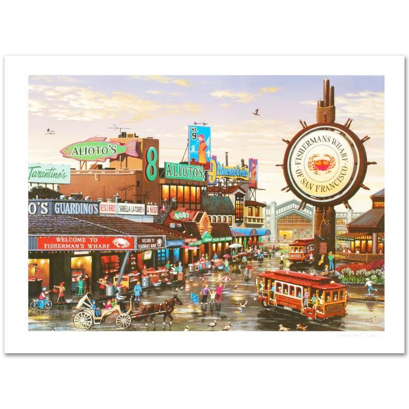 Alexander Chen creates stunningly detailed masterpieces filled with elaborate icons and a touch of fantasy. "Fisherman's Wharf" is a limited edition offset lithograph on paper by Alexander Chen, numbered and hand signed by the artist. Measures approx. 23.5" x 17.5" (with border), 21" x 15" (image).