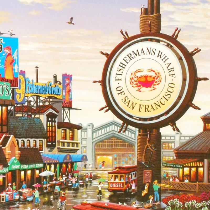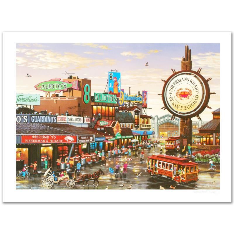 Alexander Chen creates stunningly detailed masterpieces filled with elaborate icons and a touch of fantasy. "Fisherman's Wharf" is a limited edition offset lithograph on paper by Alexander Chen, numbered and hand signed by the artist. Measures approx. 23.5" x 17.5" (with border), 21" x 15" (image).