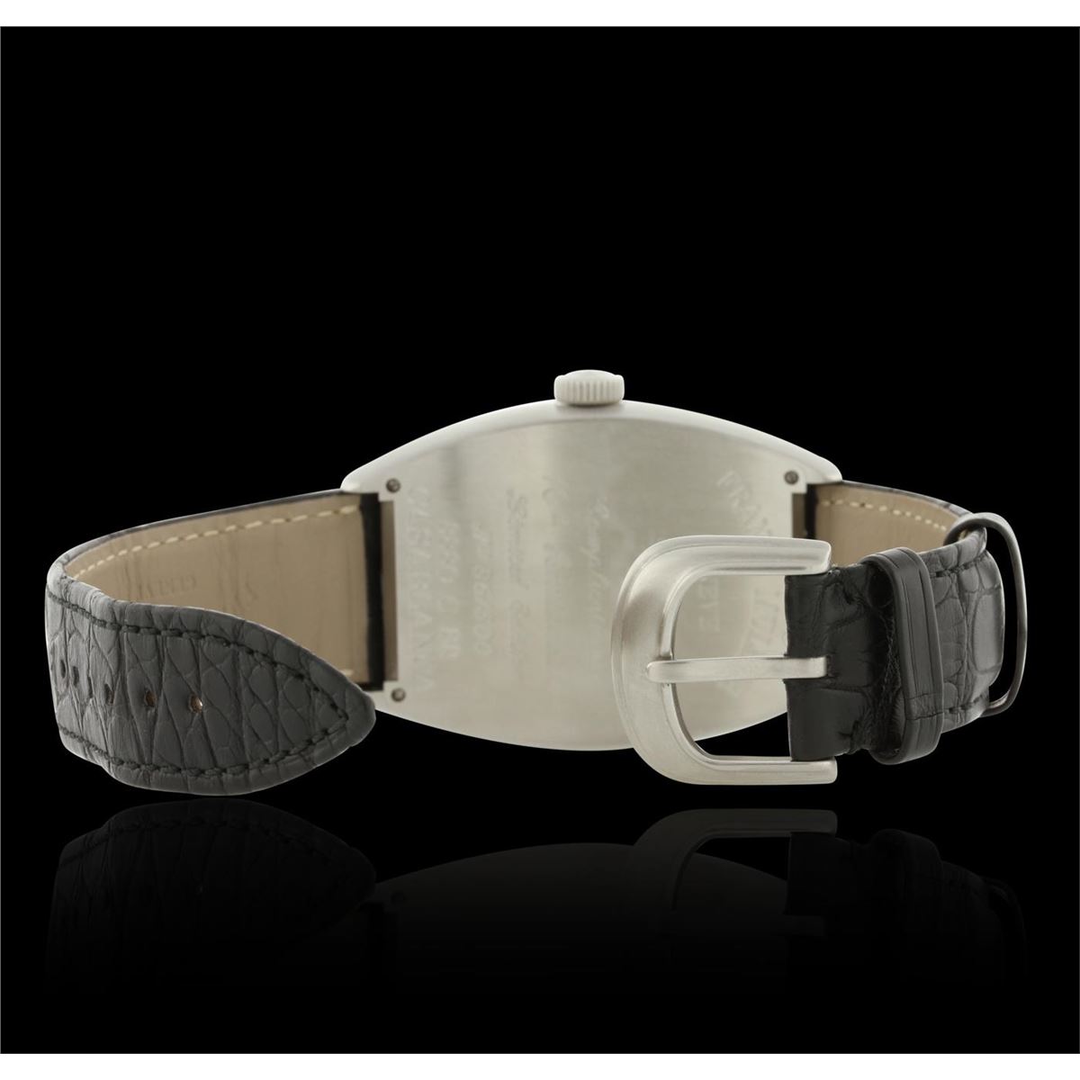 One Franck Muller Casablanca 10th Anniversary Limited Edition Stainless Steel Wristwatch featuring: 39.0 x 47.0mm stainless steel case and bezel, Original Franck Muller Black Leather Strap, Push-In Crown, White Dial, Luminescent Tone Hand Indicators and Hour Markers, Scratch Resistant Sapphire Crystal, Franck Muller Caliber 2800 Automatic Movement, Hour/Minute/Second function, 17.5mm Lug Width, Franck Muller Tang Buckle Clasp. Water resistant up to 30M / 100 Feet.