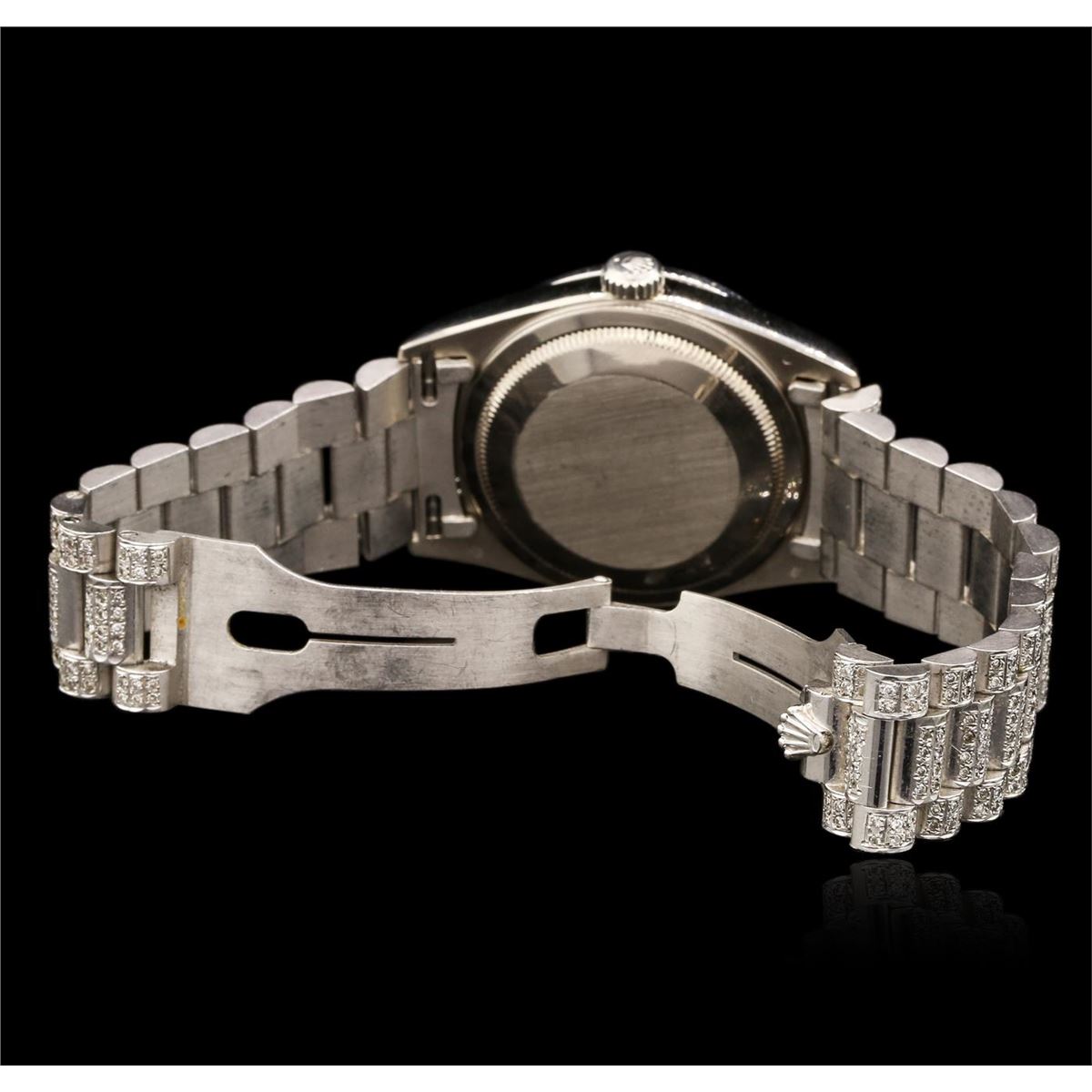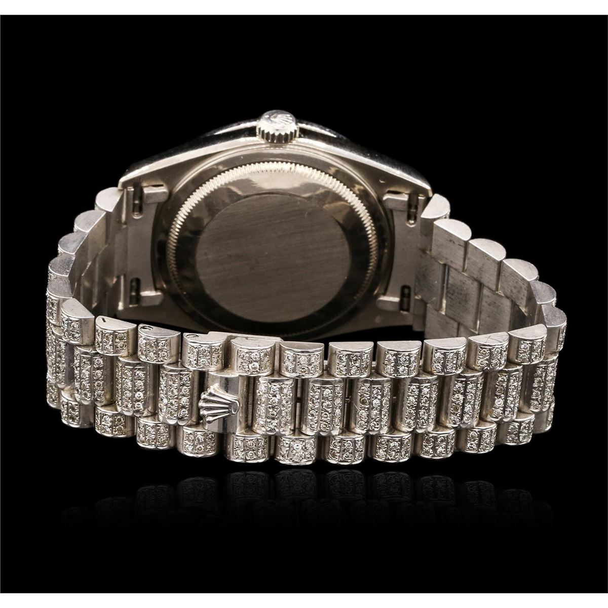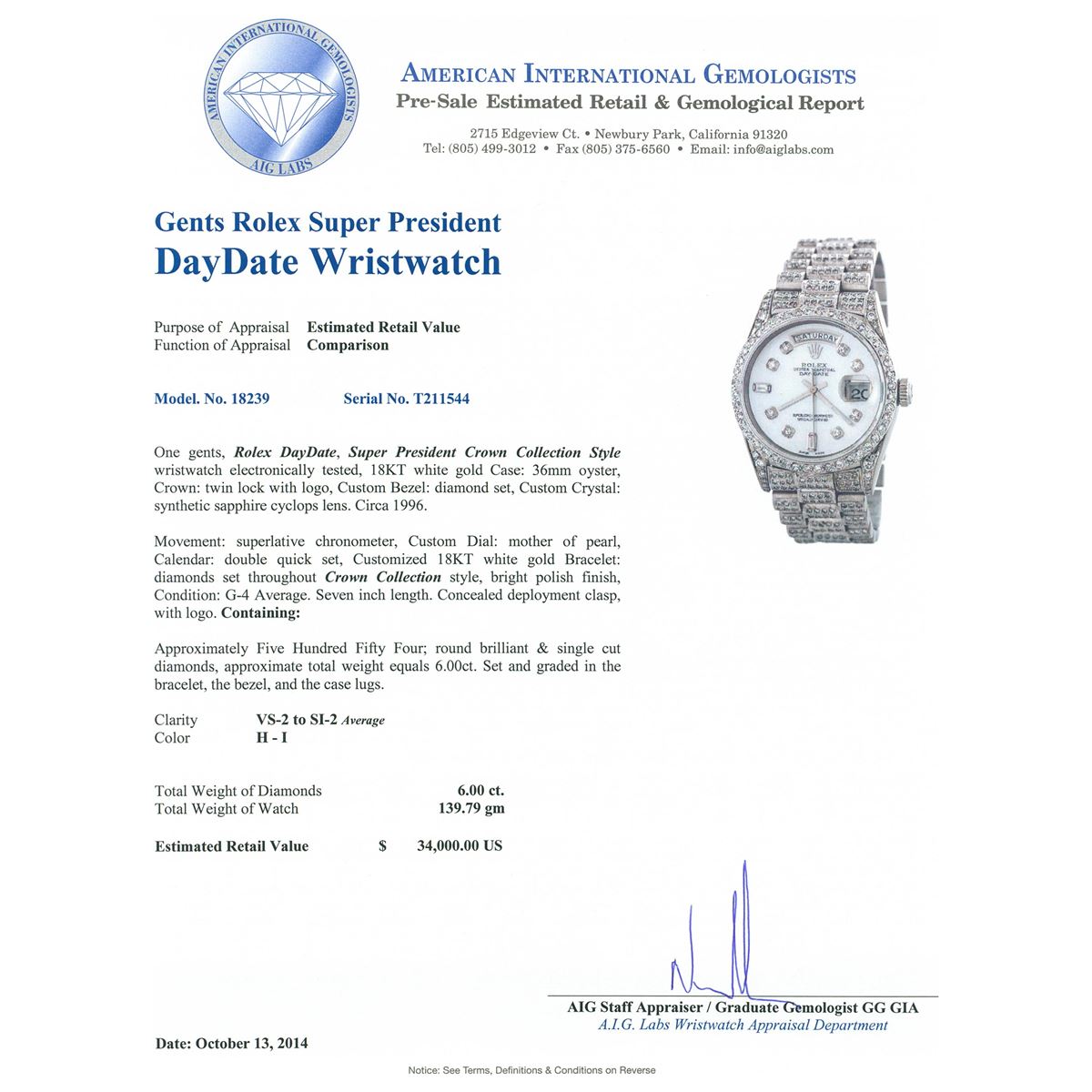 One gents, Rolex DayDate, Super President Crown Collection Style wristwatch electronically tested, 18KT white gold Case: 36mm oyster, Crown: twin lock with logo, Custom Bezel: diamond set, Custom Crystal: synthetic sapphire cyclops lens. Circa 1996.Movement: superlative chronometer, Custom Dial: mother of pearl, Calendar: double quick set, Customized 18KT white gold Bracelet: diamonds set throughout Crown Collection style, bright polish finish, Condition: G-4 Average. Seven inch length. Concealed deployment clasp, with logo. Containing: Approximately Five Hundred Fifty Four; round brilliant & single cut diamonds, approximate total weight equals 6.00ct. Set and graded in the bracelet, the bezel, and the case lugs. Clarity: VS-2 to SI-2 Average. Color: H - I. Total Weight of Diamonds 6.00ct. Total Weight of Watch 139.79 grams. AIG Appraised at $34,000.00.