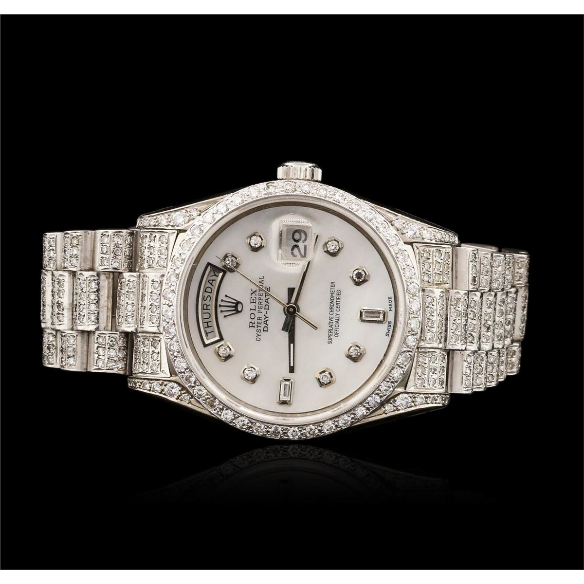 One gents, Rolex DayDate, Super President Crown Collection Style wristwatch electronically tested, 18KT white gold Case: 36mm oyster, Crown: twin lock with logo, Custom Bezel: diamond set, Custom Crystal: synthetic sapphire cyclops lens. Circa 1996.Movement: superlative chronometer, Custom Dial: mother of pearl, Calendar: double quick set, Customized 18KT white gold Bracelet: diamonds set throughout Crown Collection style, bright polish finish, Condition: G-4 Average. Seven inch length. Concealed deployment clasp, with logo. Containing: Approximately Five Hundred Fifty Four; round brilliant & single cut diamonds, approximate total weight equals 6.00ct. Set and graded in the bracelet, the bezel, and the case lugs. Clarity: VS-2 to SI-2 Average. Color: H - I. Total Weight of Diamonds 6.00ct. Total Weight of Watch 139.79 grams. AIG Appraised at $34,000.00.