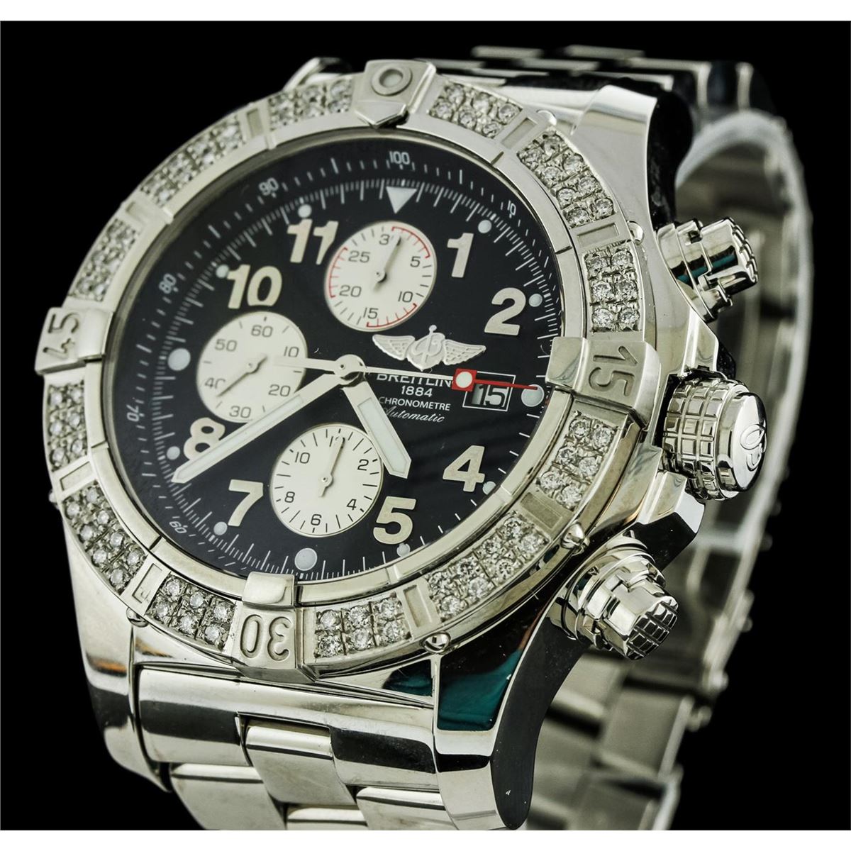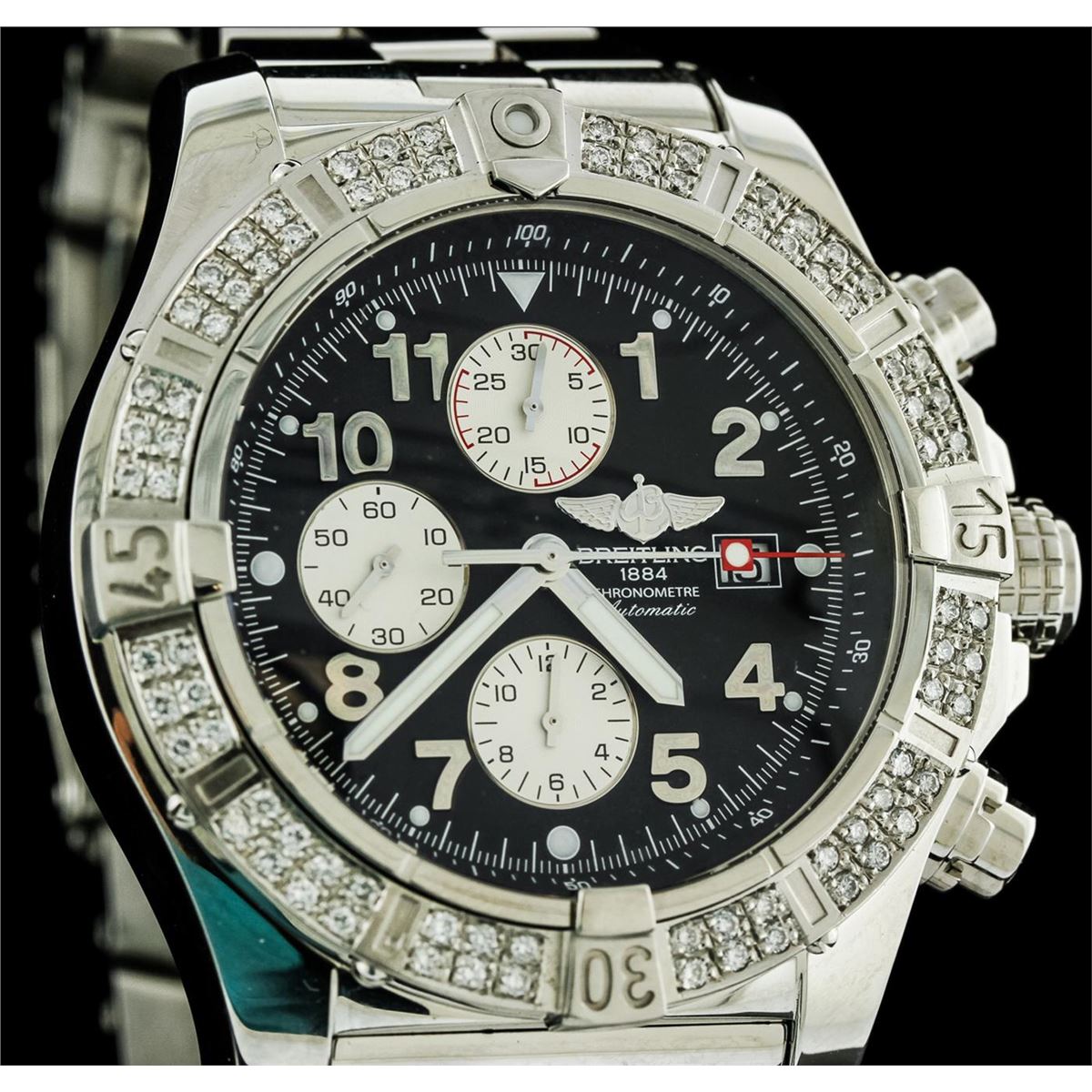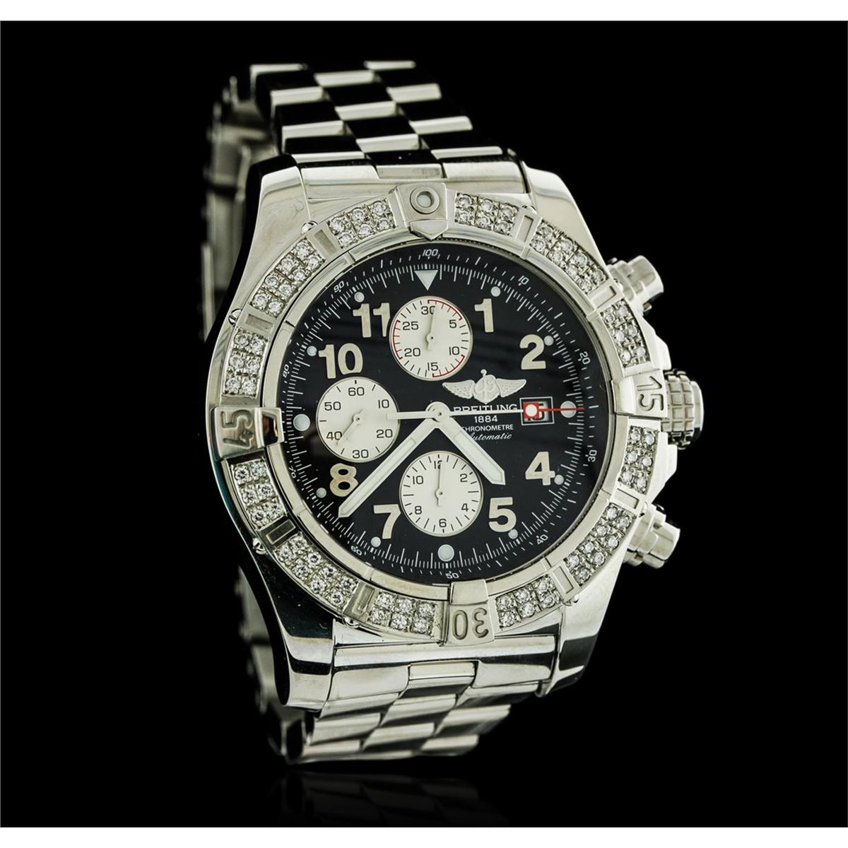 One, Breitling Chronograph wristwatch the Aeromarine Super Avenger electronically tested Stainless Steel, Case: 48mm diameter, Case Back: engraved with Breitling logo, manufacturers information and ID numbers, Water Resistant: 300 meters / 1000 feet, Customized Uni-Directional Bezel: diamond set, Crown: twin lock with logo, set within protective shoulders, Crystal: synthetic sapphire, Movement: Breitling 13, ETA Valjoux 7750, Automatic Certifie Chronometre. Dial: Black color, with Blue luminous baton pointed type hands, & numerals, Date Window: three o'clock position date display, Chronograph Functions: silver sub dials for; hours, minutes and continuous seconds, stainless steel pushers. Power Reserve: 42 Hours, Bracelet: Stainless Steel Professional II, eight and one half inch length, with the flip lock clasp. Condition: G-5 Fine. Bright polish finish. Containing: Eighty prong set round brilliant cut diamonds, approximate total weight equals 1.00ctw. Set & graded in the bezel. Clarity: VS-2 to SI-2. Color: G - I. Total Weight of Diamonds 1.00ctw. Total Weight of Wristwatch 261.39gm. AIG Appraised at $8,550.00.