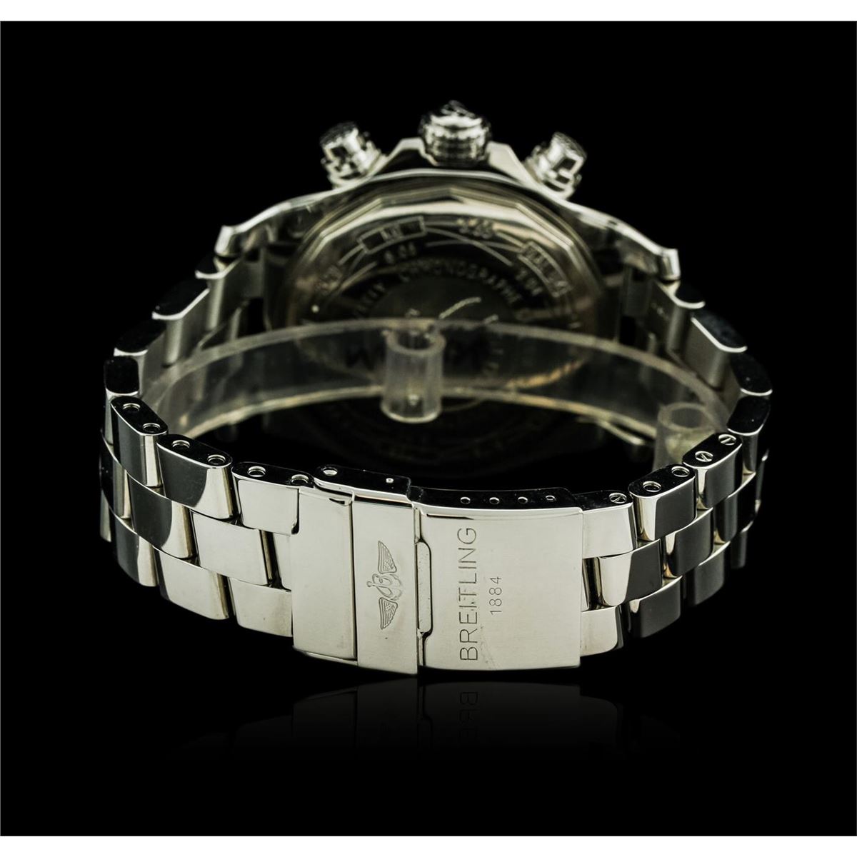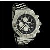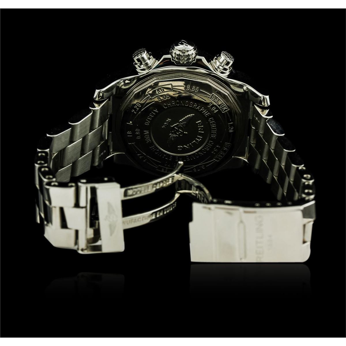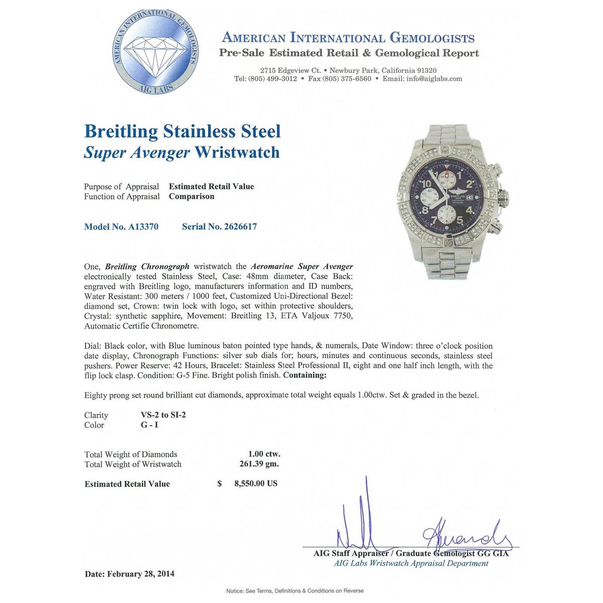 One, Breitling Chronograph wristwatch the Aeromarine Super Avenger electronically tested Stainless Steel, Case: 48mm diameter, Case Back: engraved with Breitling logo, manufacturers information and ID numbers, Water Resistant: 300 meters / 1000 feet, Customized Uni-Directional Bezel: diamond set, Crown: twin lock with logo, set within protective shoulders, Crystal: synthetic sapphire, Movement: Breitling 13, ETA Valjoux 7750, Automatic Certifie Chronometre. Dial: Black color, with Blue luminous baton pointed type hands, & numerals, Date Window: three o'clock position date display, Chronograph Functions: silver sub dials for; hours, minutes and continuous seconds, stainless steel pushers. Power Reserve: 42 Hours, Bracelet: Stainless Steel Professional II, eight and one half inch length, with the flip lock clasp. Condition: G-5 Fine. Bright polish finish. Containing: Eighty prong set round brilliant cut diamonds, approximate total weight equals 1.00ctw. Set & graded in the bezel. Clarity: VS-2 to SI-2. Color: G - I. Total Weight of Diamonds 1.00ctw. Total Weight of Wristwatch 261.39gm. AIG Appraised at $8,550.00.