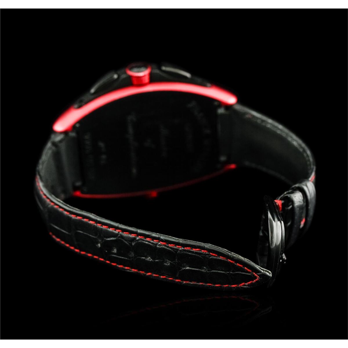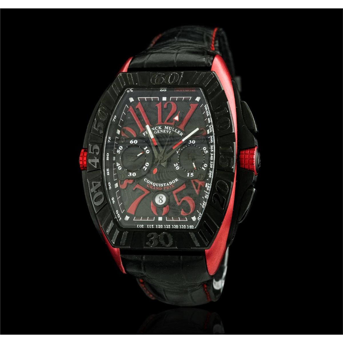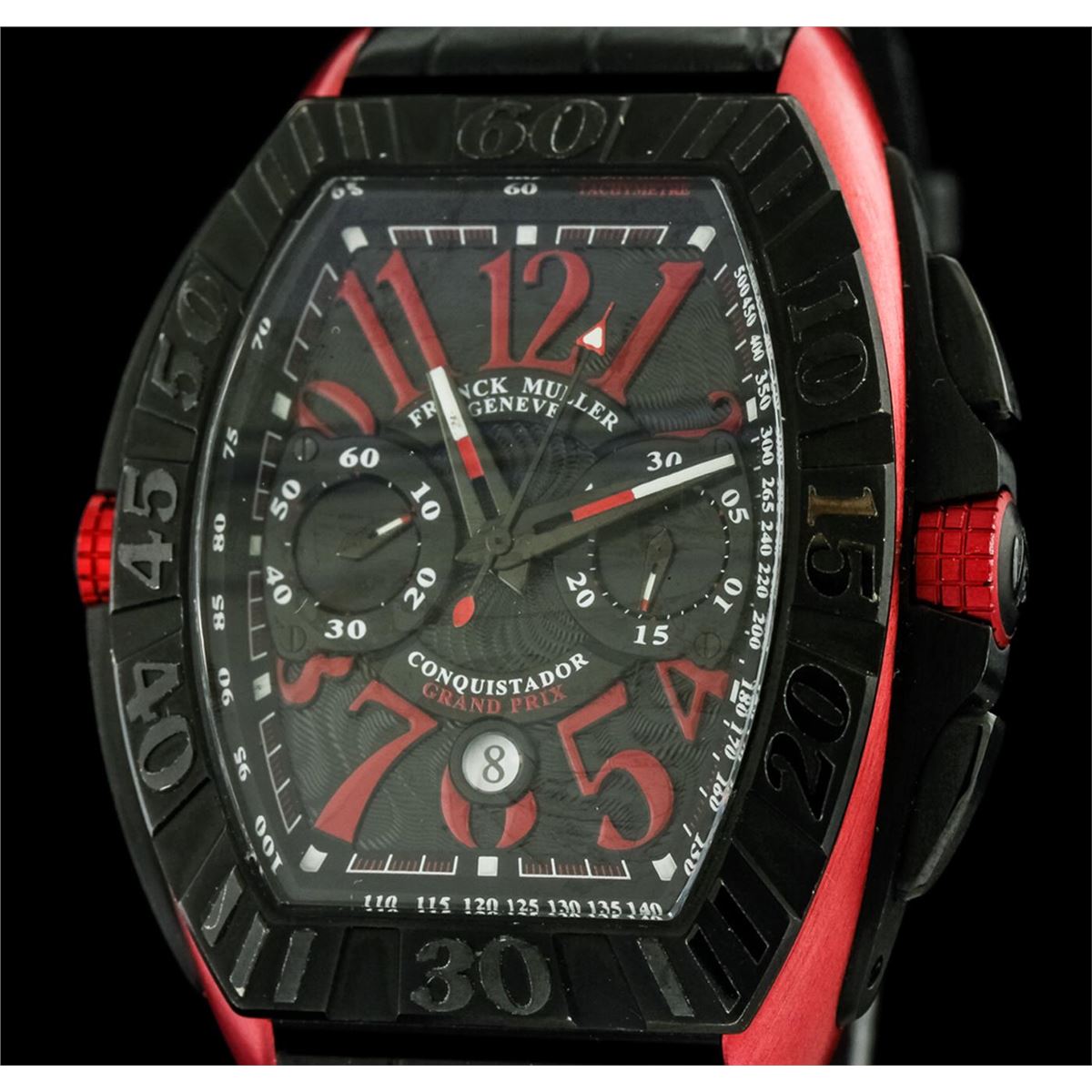 One, Franck Muller Conquistador Grand Prix Wristwatch, electronically tested, Red Ergal (aluminum alloy, with zinc) and PVD Titanium Case: 62mm x 48mm, Case Back: secured by four set screws, engraved with the manufacturers name and ID numbers, Crown: logo'd, set between the Chronograph pushers, Fixed PVD Bezel, Crystal: domed anti-reflective sapphire crystal, Movement: Calibre FM800, Swiss automatic. Power Reserve: 42 hours, Dial: Black, with blue luminous hands, and Red applied numerals, Date Window: 6 o'clock position, Chronograph Functions: two sub dials for; Minutes, and continuous Seconds, Franck Muller Bracelet: saddle stitched leather strap, nine inch length adjustable. Condition: G-7 Near Mint. Total Weight of Watch 130.83gm. AIG Appraised at $21,550.00.