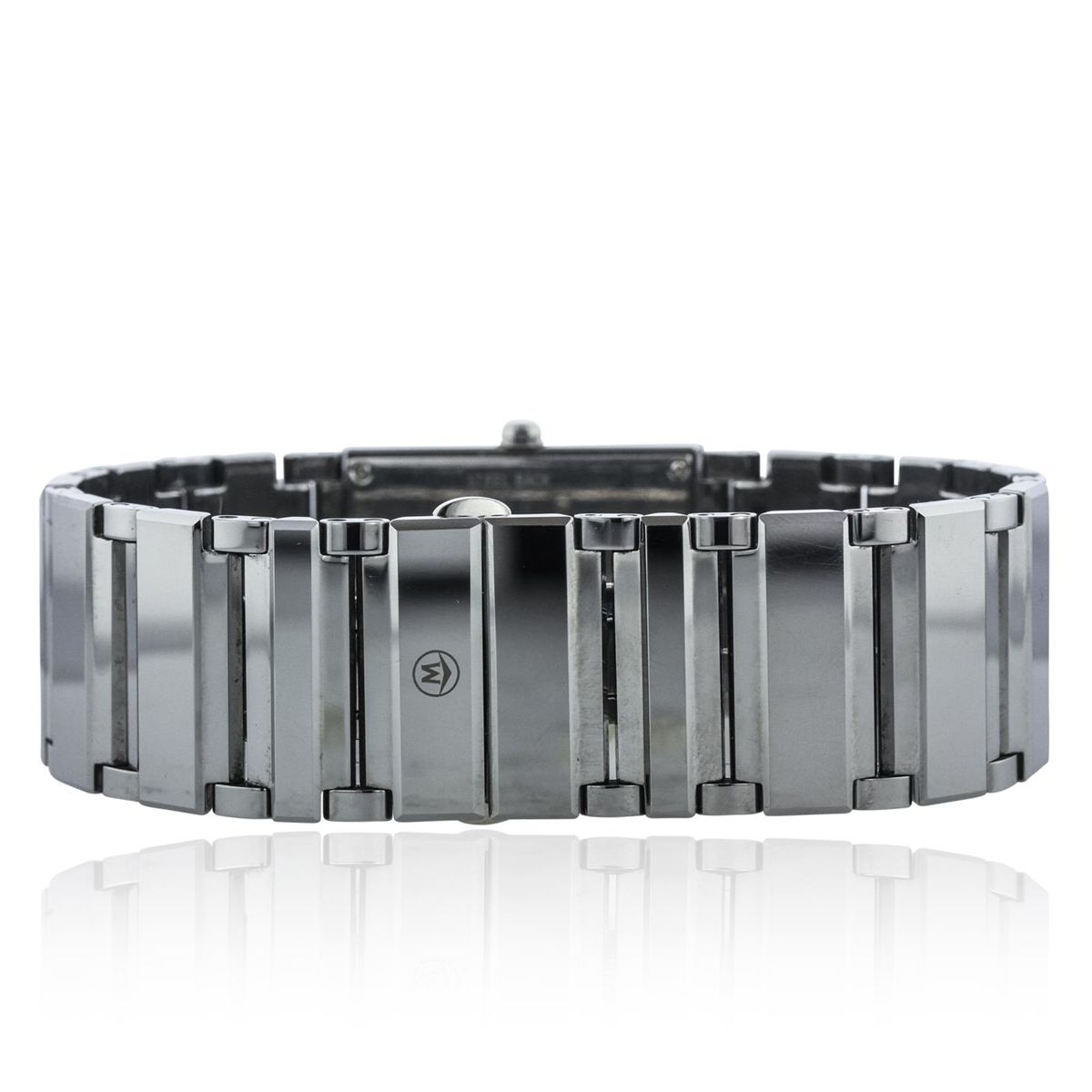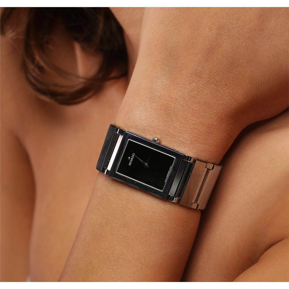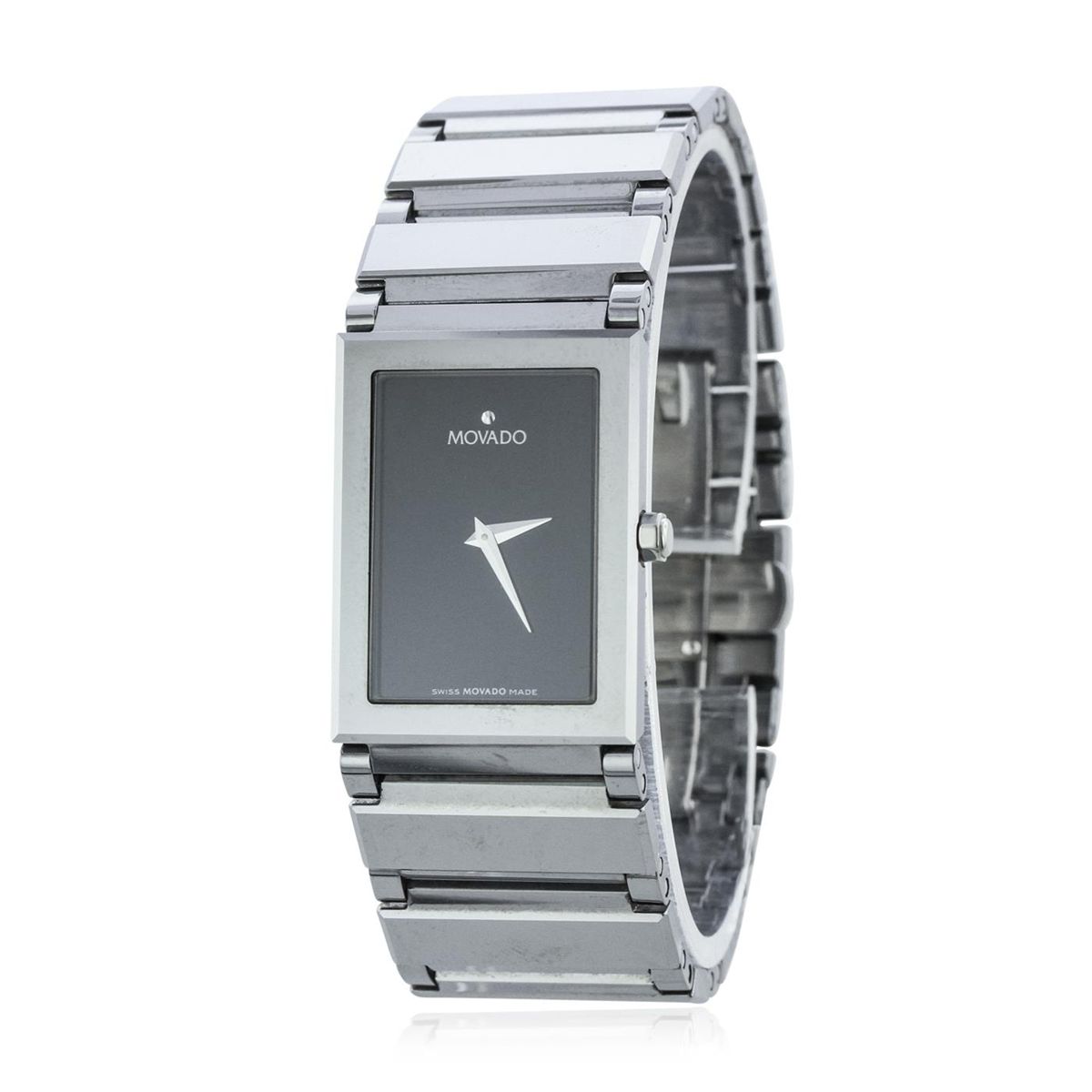 One Movado Valor wristwatch weighing 86.29 grams featuring: 24mm tungsten carbide band, tungsten deployment clasp, tungsten case, lugs, and crown, black museum dial with analog display, silver finish minute and hour hands, Movado marker at 12 o'clock position, Swiss Movado made marker at 6 o'clock position, Swiss made quartz movement, water resistant.