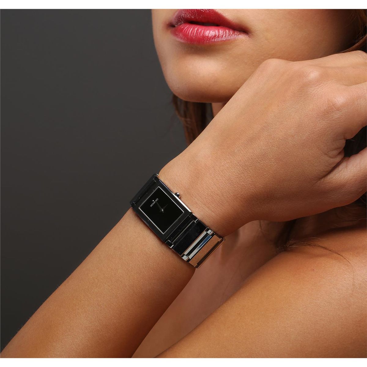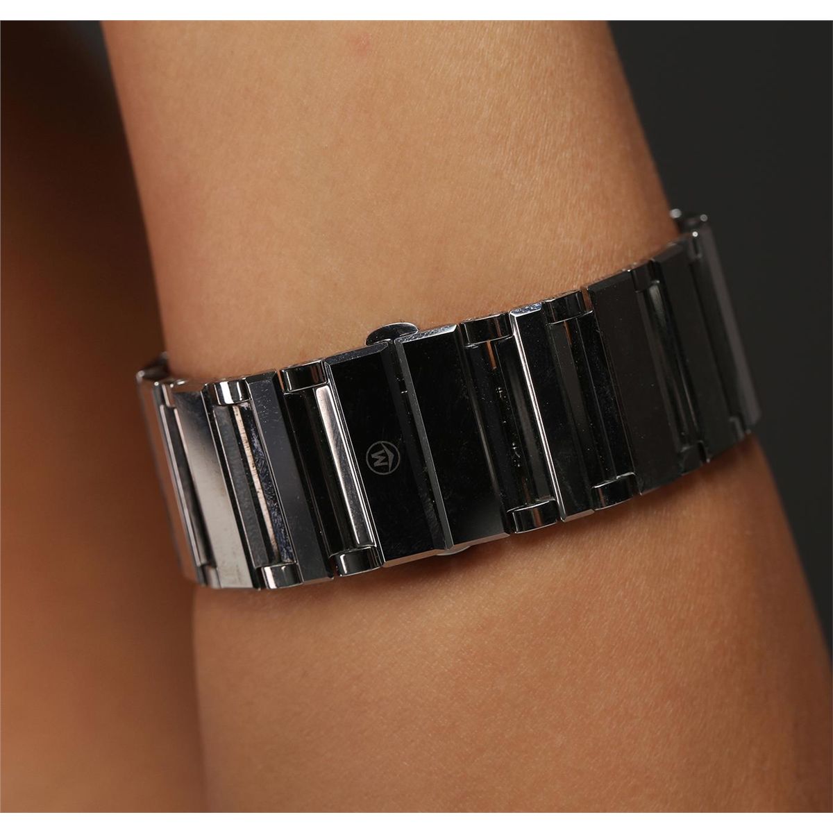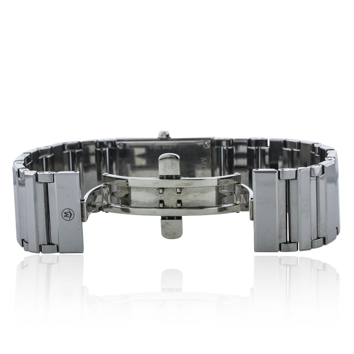 One Movado Valor wristwatch weighing 86.29 grams featuring: 24mm tungsten carbide band, tungsten deployment clasp, tungsten case, lugs, and crown, black museum dial with analog display, silver finish minute and hour hands, Movado marker at 12 o'clock position, Swiss Movado made marker at 6 o'clock position, Swiss made quartz movement, water resistant.